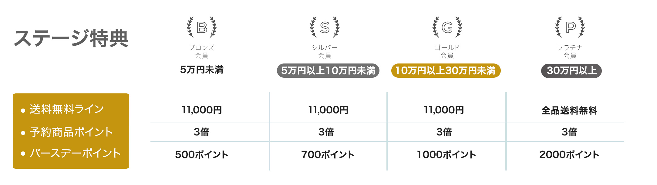 ブロンズ会員からプラチナ会員まで4つのステージをご用意。ご購入金額に応じて所属するステージが変化します。ステージごとにさまざまな特典をご提供。今後さらに新しいサービスなどもご用意する予定です。