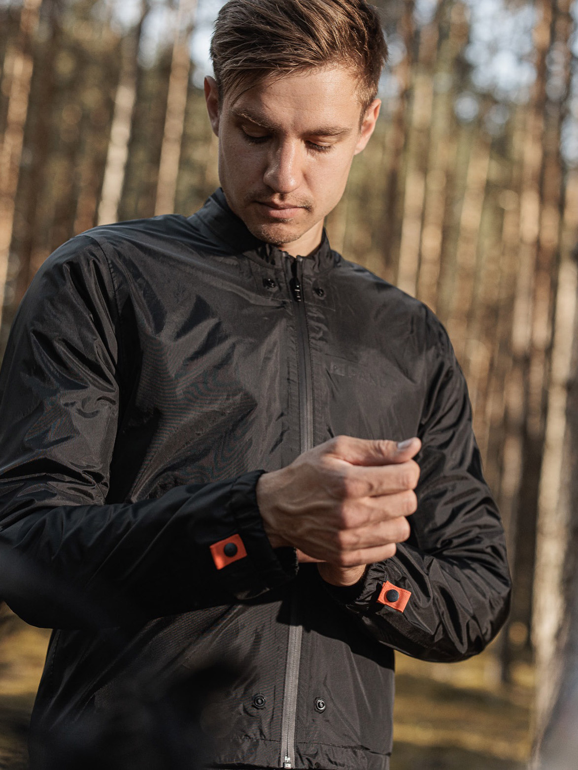 防水YKKジッパー付きのフロントポケットには、小物などを収納可能。袖口には「Pando」の反射プリントが施されており、夜間の視認性も向上させています。