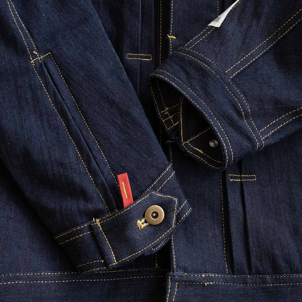 1stタイプをベースにしたデニムジャケットはダブルジッパーとボタンフライの二重フロント仕様。チンガードで首元を風からガードすることも可能です。