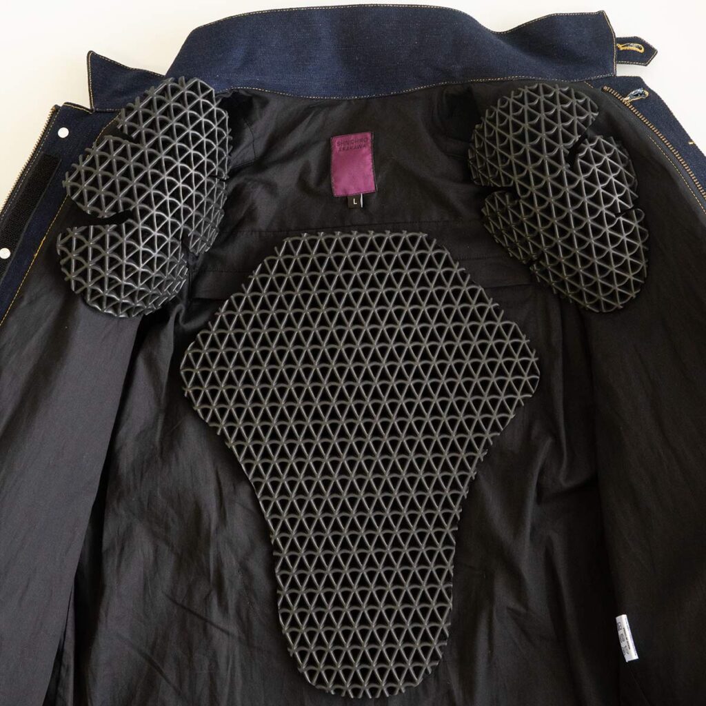 真鍮のドーナツボタンがヴィンテージ感も演出。ソフトプロテクターが肩、肘、背中に付属するため、長時間のライディングにもおすすめです。