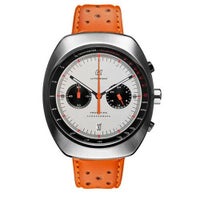 イタリア語でプロトタイプカーを意味するPROTOTIPOは、1960年代から70年代前半にかけて活躍したレーシングマシンのトレンドであった丸みを帯びたフェンダーの形状やメーターパネルをモチーフとしたデザインが特徴的。無線やラップタイマーなどが存在しなかったこの時代に、クロノグラフはトップレーサーにとってレースに欠かせない必需品でした。 「PROTOTIPO CHRONOGRAPH」は、常に危険と隣り合わせだった黎明期のレース時代を生き抜いてきたレーサーたちに捧げるオマージュモデルとなっています。