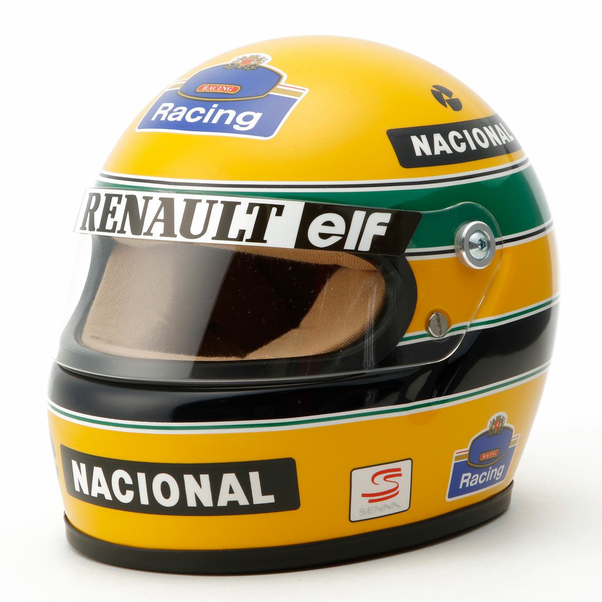 アイルトン・セナの1/2スケールヘルメットです。セナにとって最後のシーズンとなったウィリアムズ・ルノー時代の1994年仕様のヘルメットです。 精密に作られた1/2スケールでセナのヘルメットを再現。専用のスペシャルボックスだけでなく、ヘルメット袋もセナカラーというこだわりです