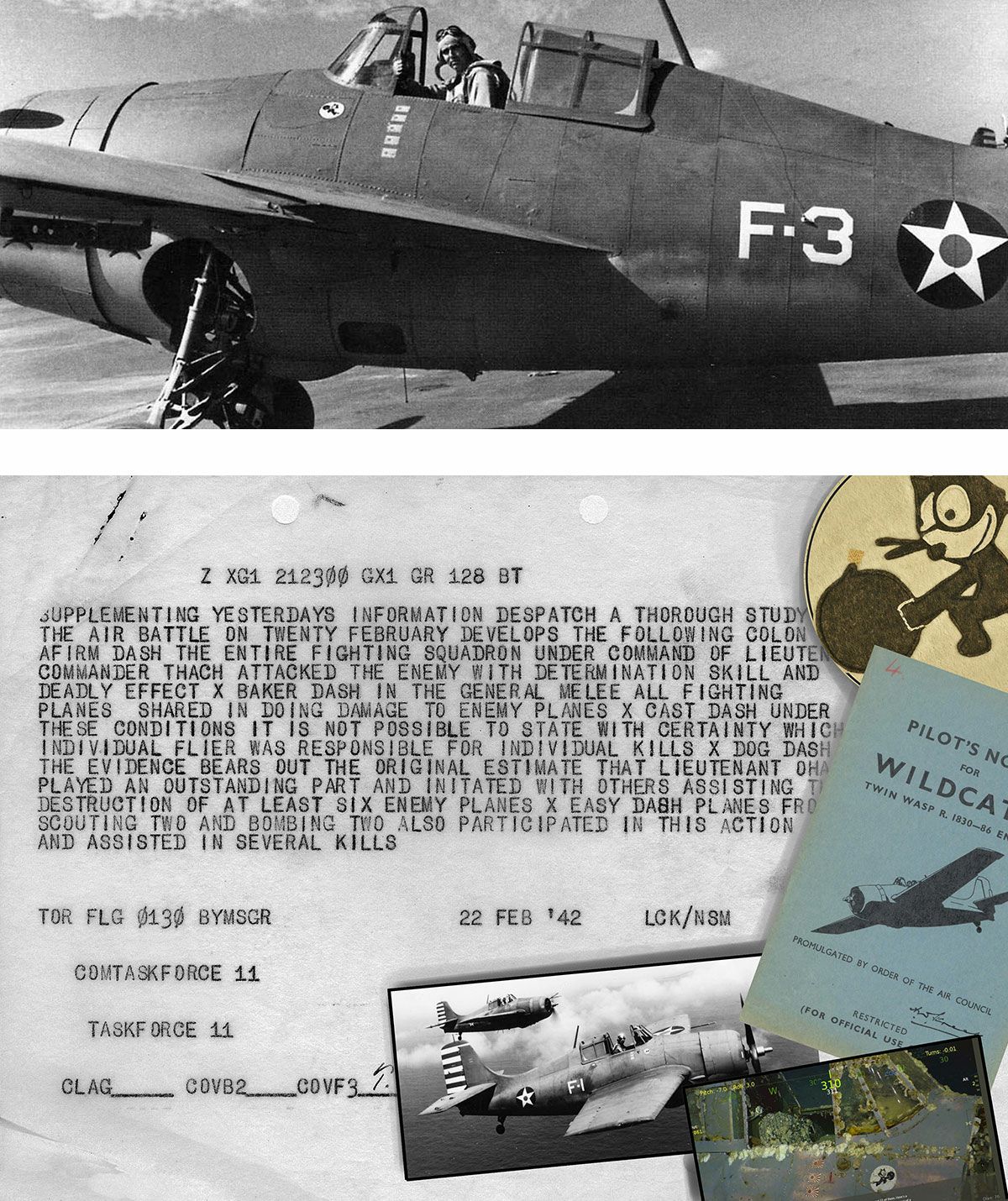2018年3月にアメリカの探査チームにより、珊瑚海の水深3000mで、米空母レキシントンの残骸と一緒に発見された F4F-3ワイルドキャットの機体に描かれていたフィリックスがプリントされています。