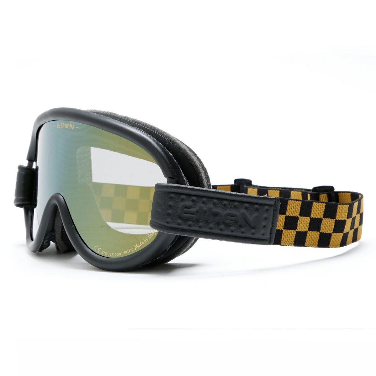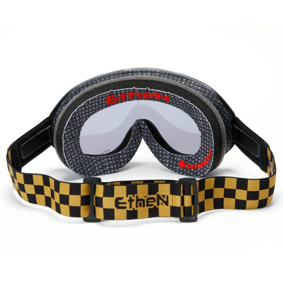 交換可能なストラップの裏側にはヘルメットとの密着性を高める滑り止めのシリコン付き。ゴールドのハーフミラーレンズを標準で採用しています。