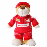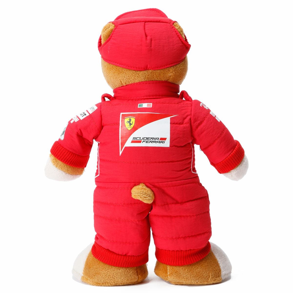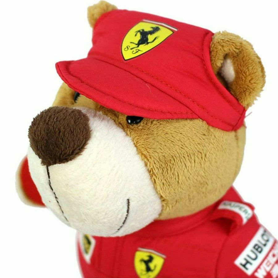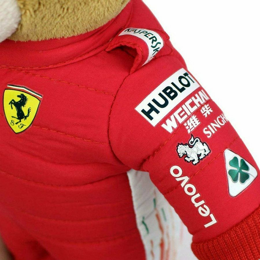 全長26cmのテディベアが、フェラーリF1チームのレーシングスーツを身にまとっており、スポンサーロゴも忠実に再現されています。
