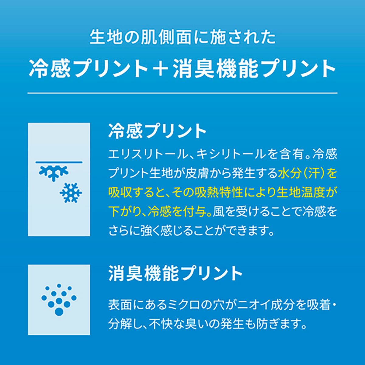 裏地全面にエリスリトール、キシリトールを含有した特殊な『氷撃』冷感プリントを施しています。