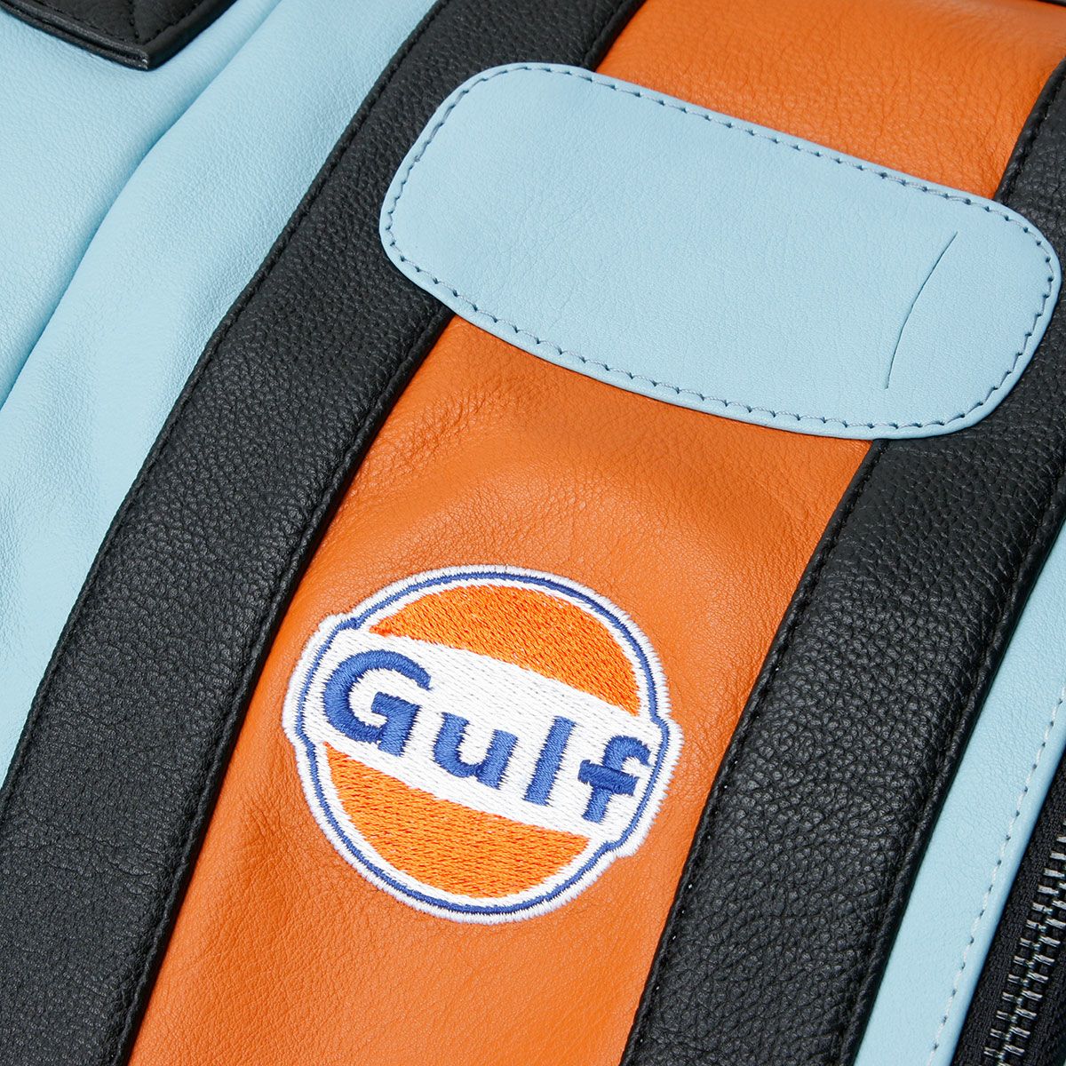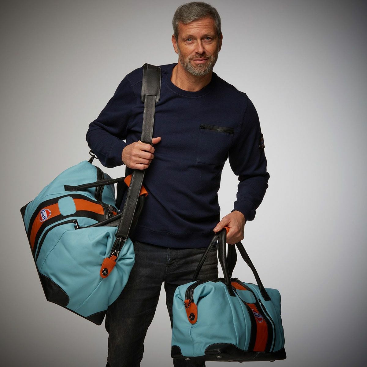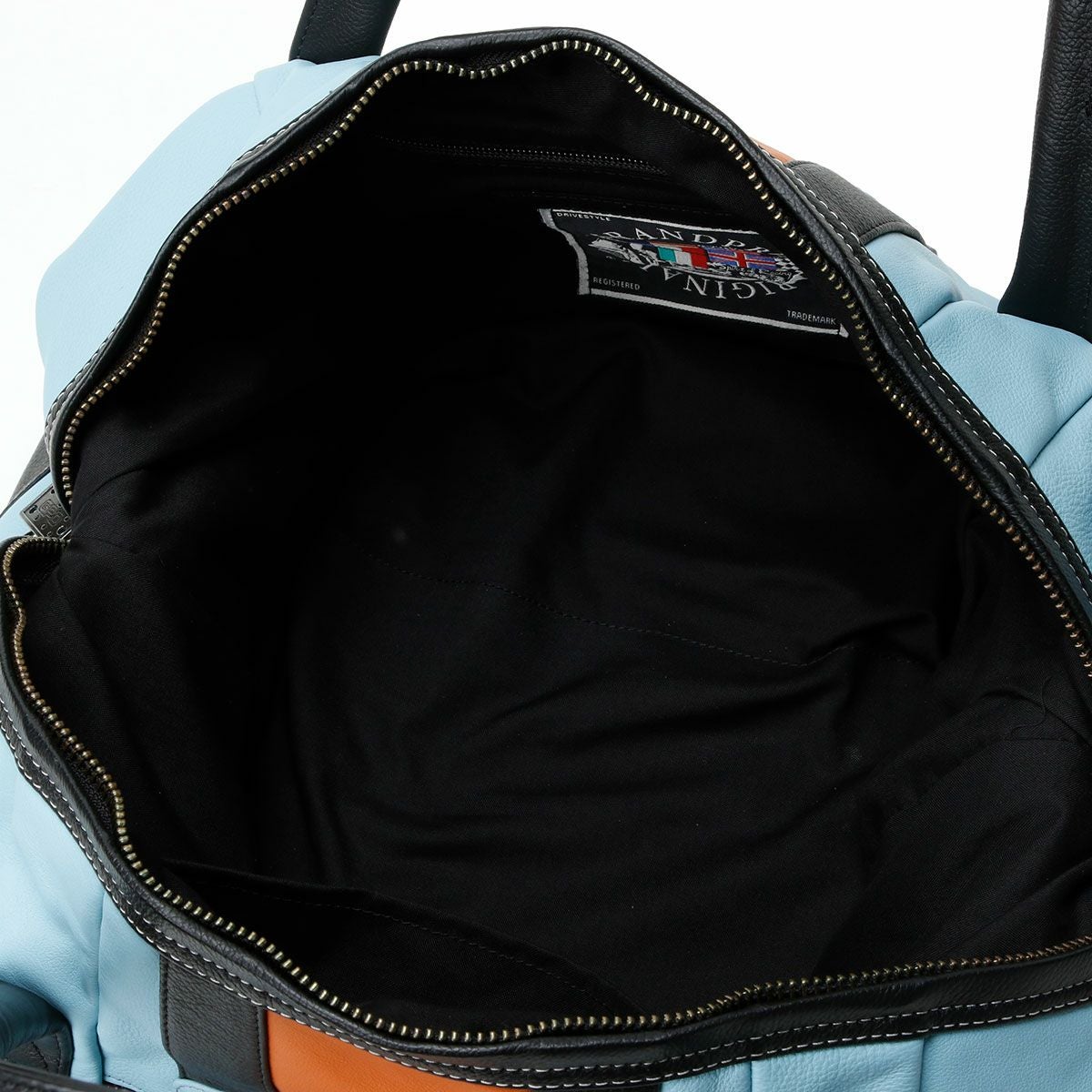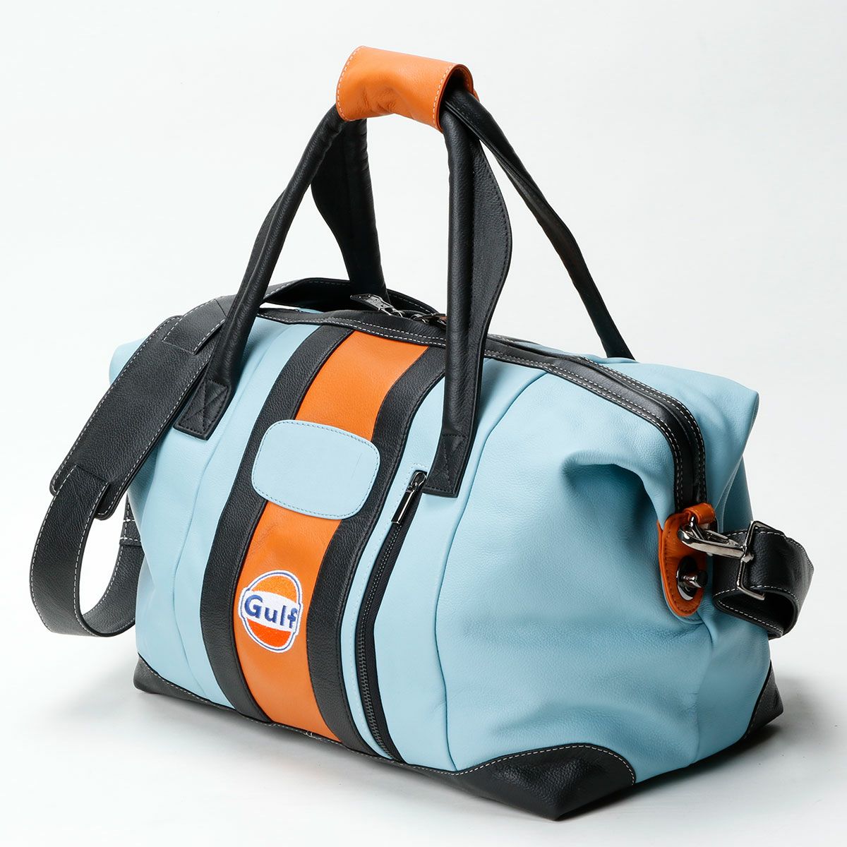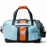 伝統的なガルフブルーをメインにブラックとオレンジのストライプがアクセントとなった、ガルフオリジナルのレザートラベルバッグ。