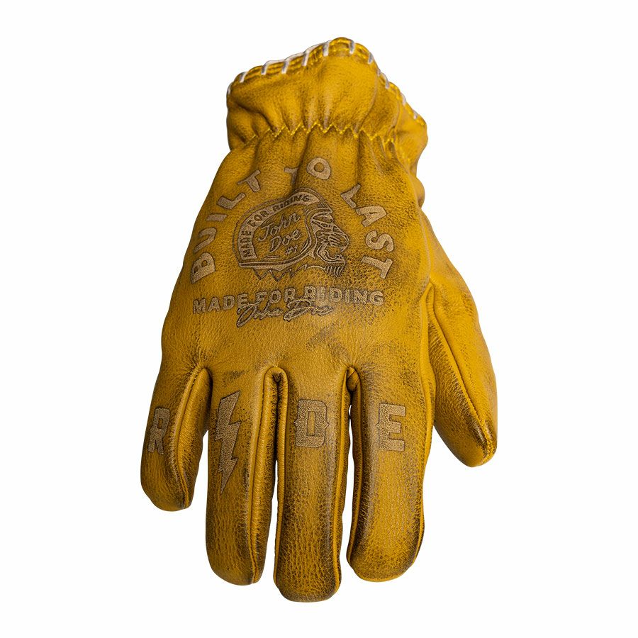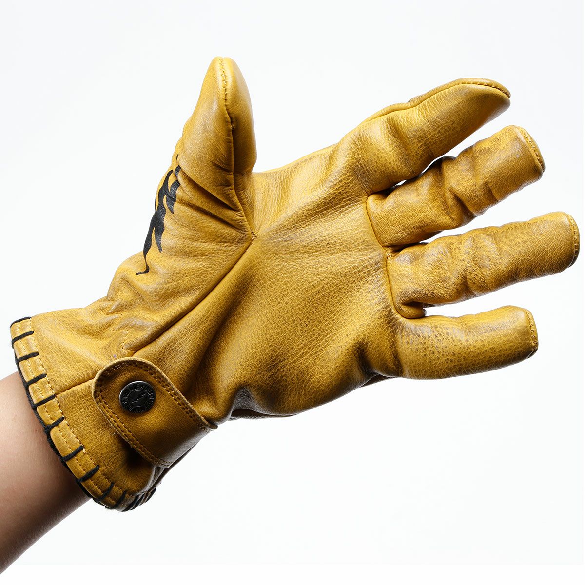 袖口のステッチングや指・甲部のエンボス加工がグローブにユニークなスタイルを与えています