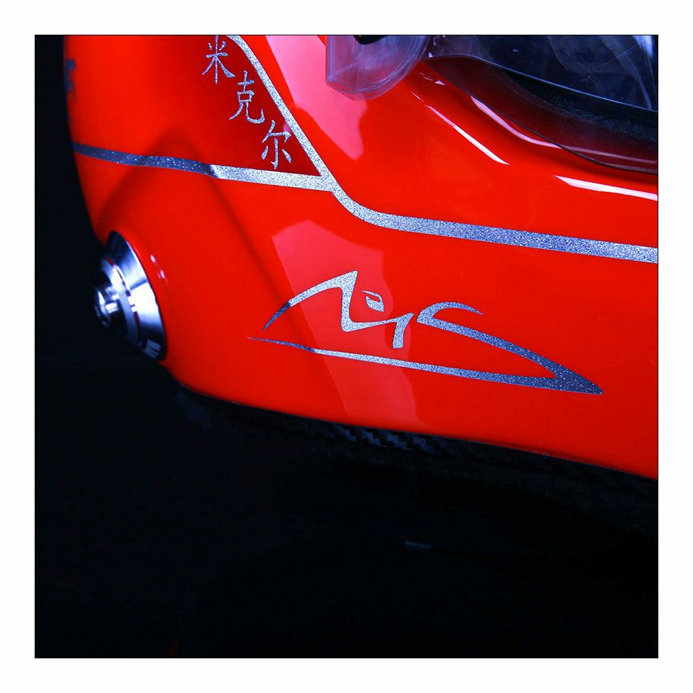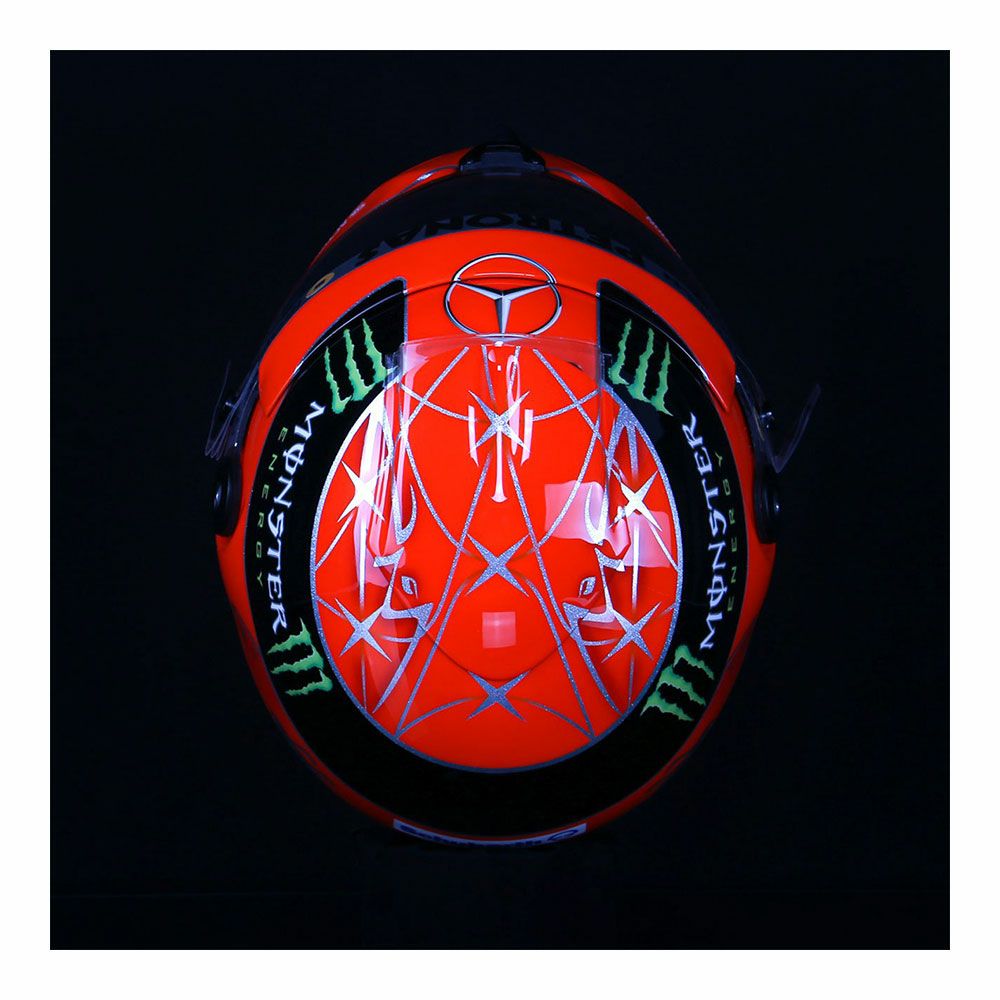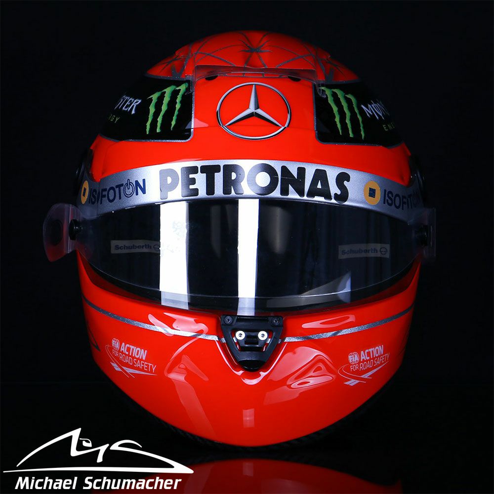 実際に供給されていたシューベルト製のカーボンヘルメットをベースに使用しており、ミハエル"最後"のF1レースとなった2012年ブラジルGP仕様のスペシャルデザインのヘルメットは、最終戦のヘルメットのみに刻まれたメッセージなども忠実に再現。