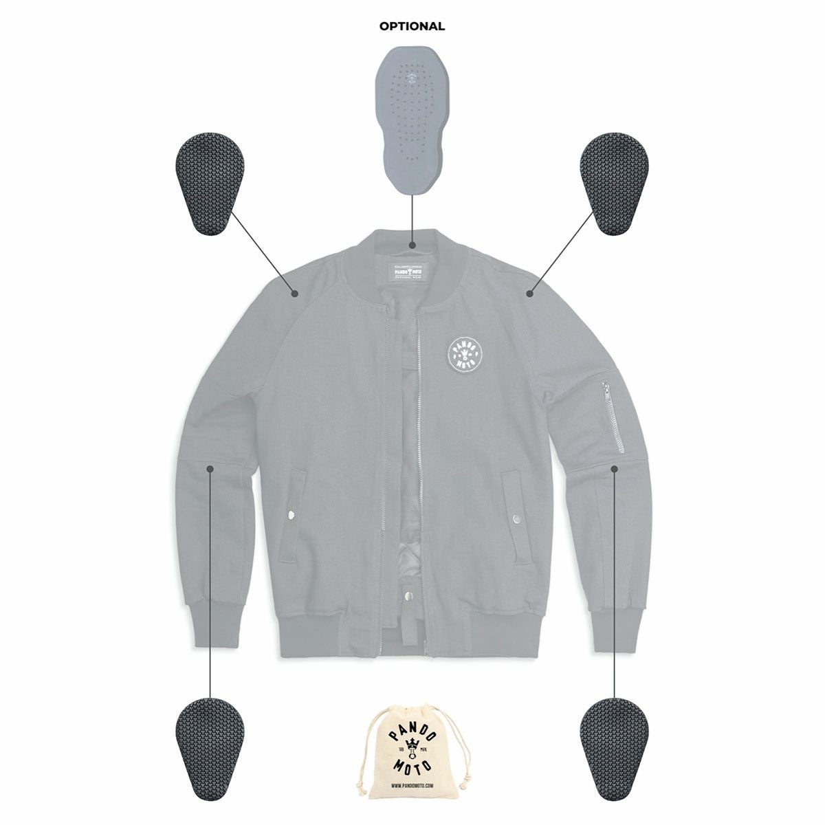 ライディング時の裾上がりを考慮し、背中の丈が長めに作られておりますが、パンツとジャケットを繋げるループが付いているので組み合わせると高速走行の際のバタつきを軽減。背面には反射素材を使い描かれたブランドのロゴとシングルラインがパンドモトの世界観を演出しております。
