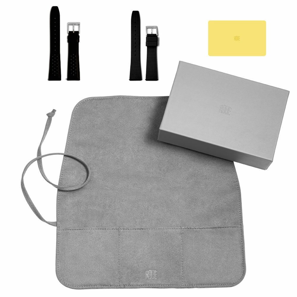 脱着が容易なレザーベルトとスポーティーなシリコンベルト、スエードのツールロールタイプのケースとクリーニングクロスが付属されています。