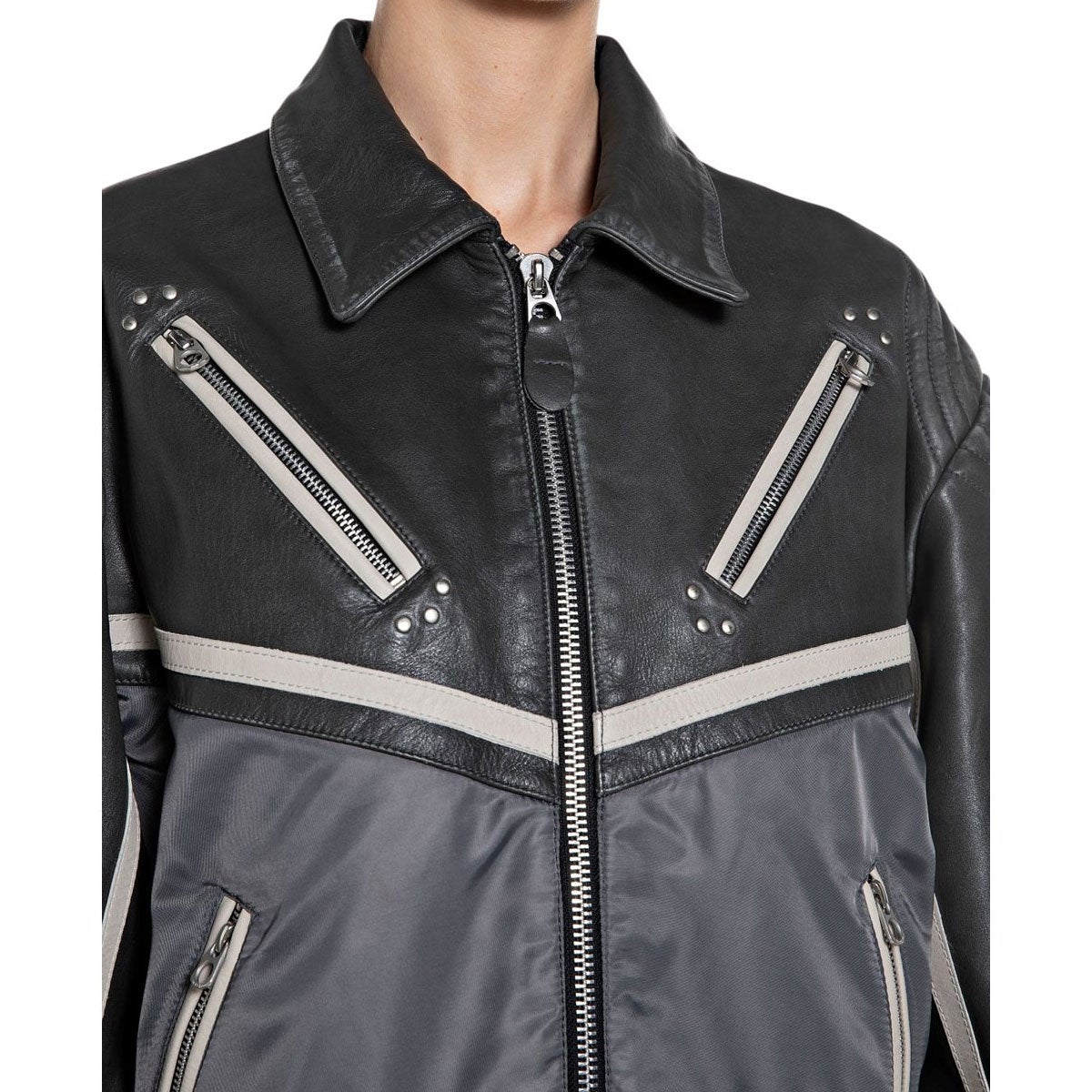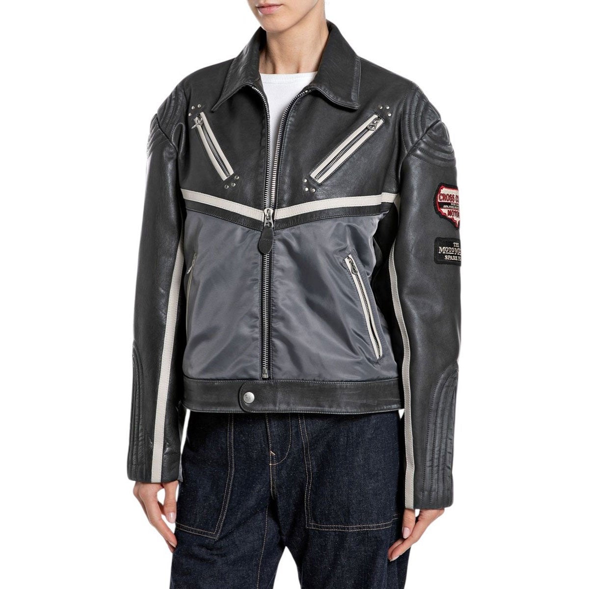 上質なカウハイドレザーとモダンなテクニカルファブリックを素材を融合させた、ボーイフレンドフィットのレザージャケット。