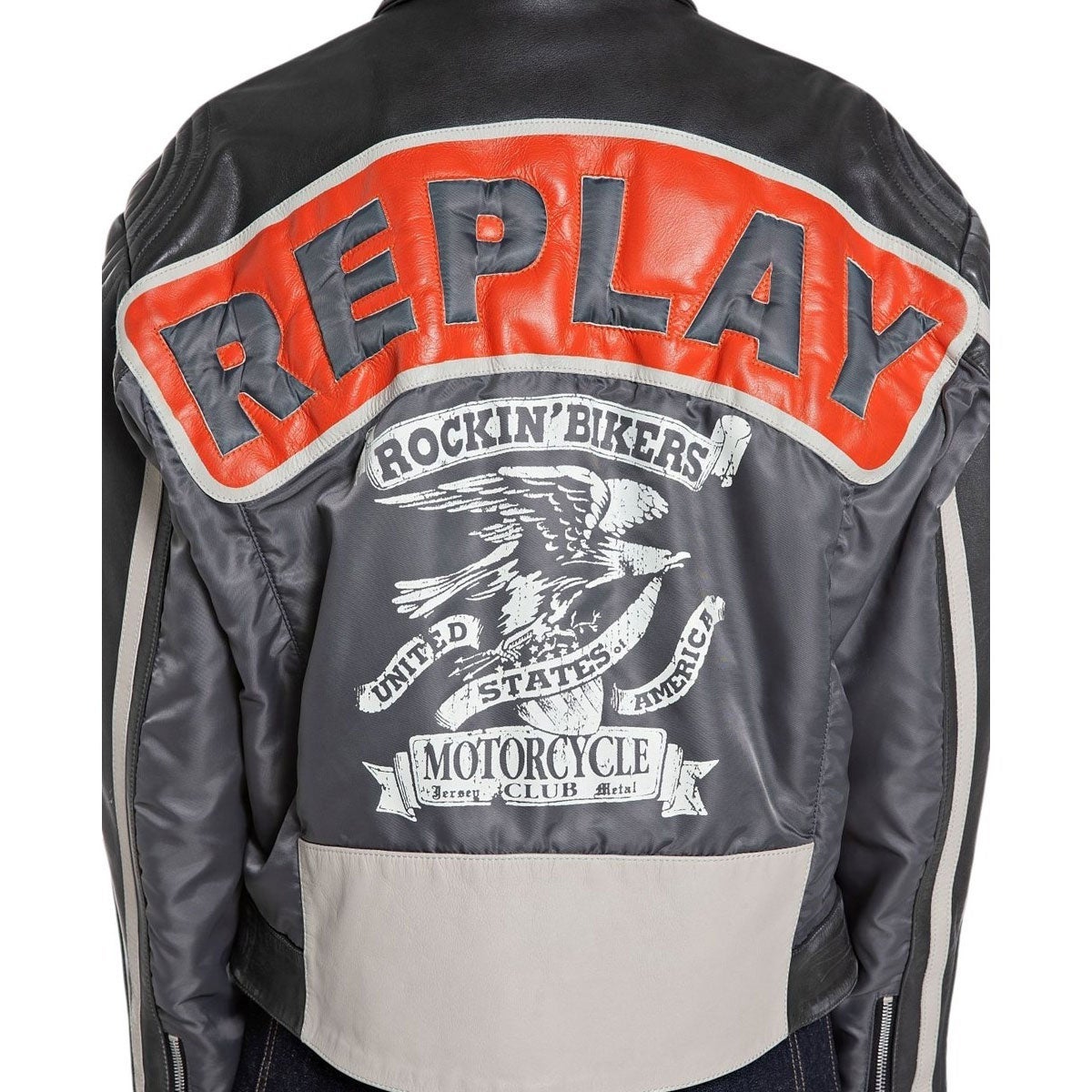 袖にあしらわれたレタリングエンブレムや、背面を飾るイーグルのマキシプリント、さらにコントラストの効いたReplayロゴが、バイカースタイルのスピリットを際立たせます。
