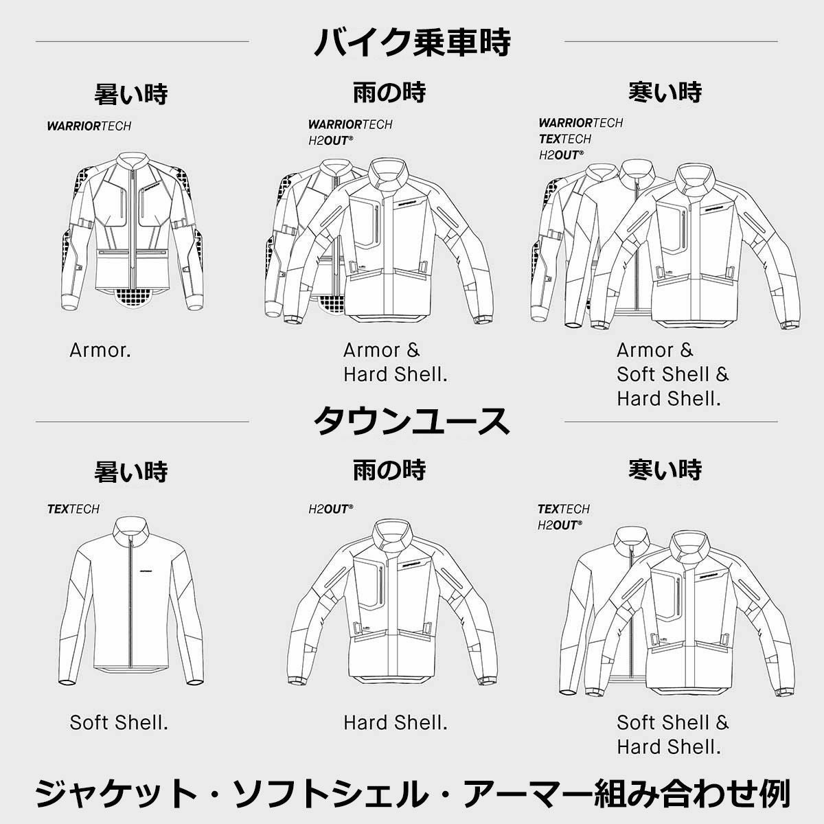 SPIDIの「STEP-IN ARMORテクノロジー」は、軍用航空分野での研究から着想を得たもので、ハードシェル、ソフトシェル、アーマーの3つのジャケットを自在に組み合わせることで、ライディングからタウンユースまで理想的な機能性を得ることが可能となります。