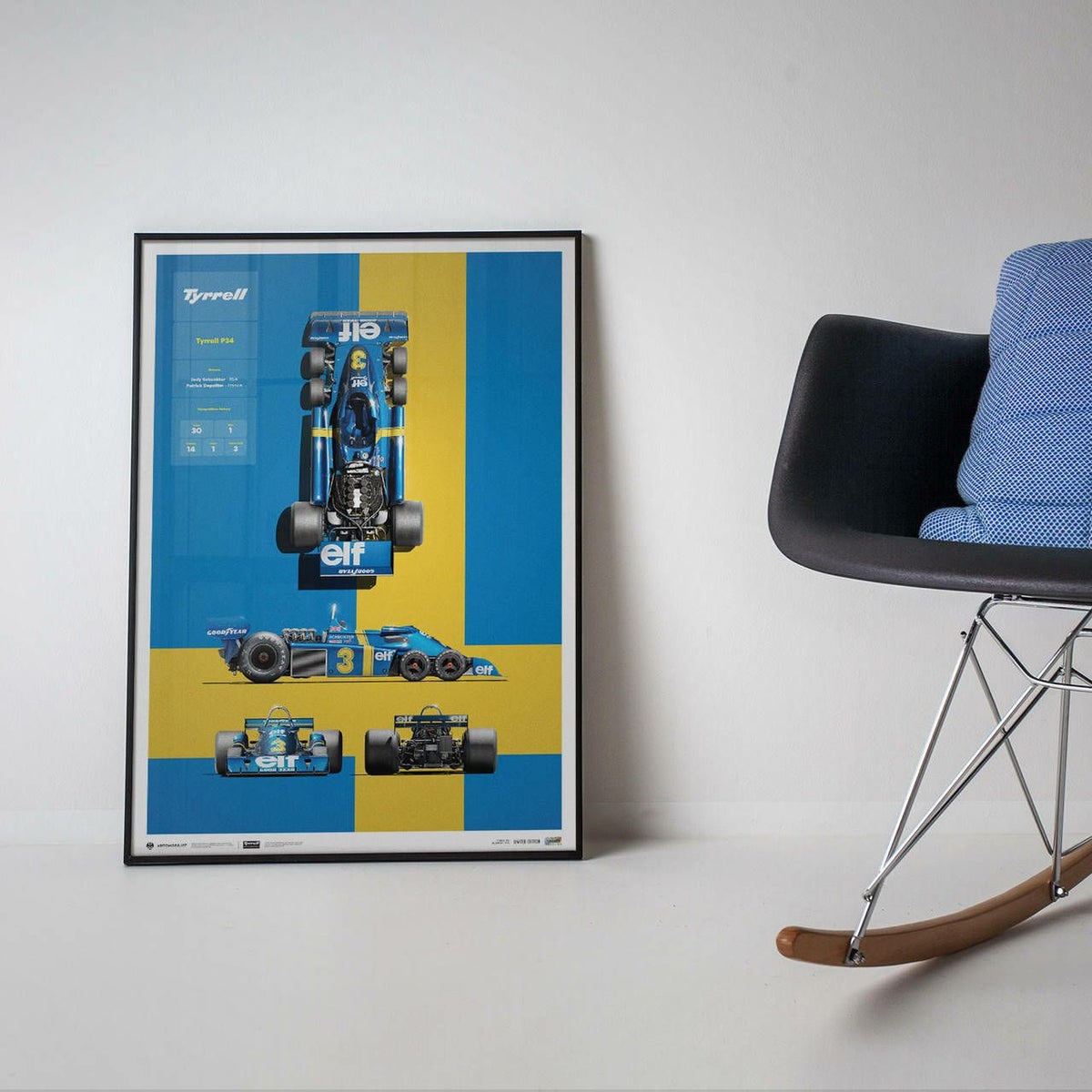 1976年シーズンを戦ったティレル P34を真上、横、正面、背面から見たグラフィカルなブループリントがそれぞれ描かれており、ポスターの左上には、チーム名や、ドライバー、出走回数、勝利数などの戦績が書かれています。