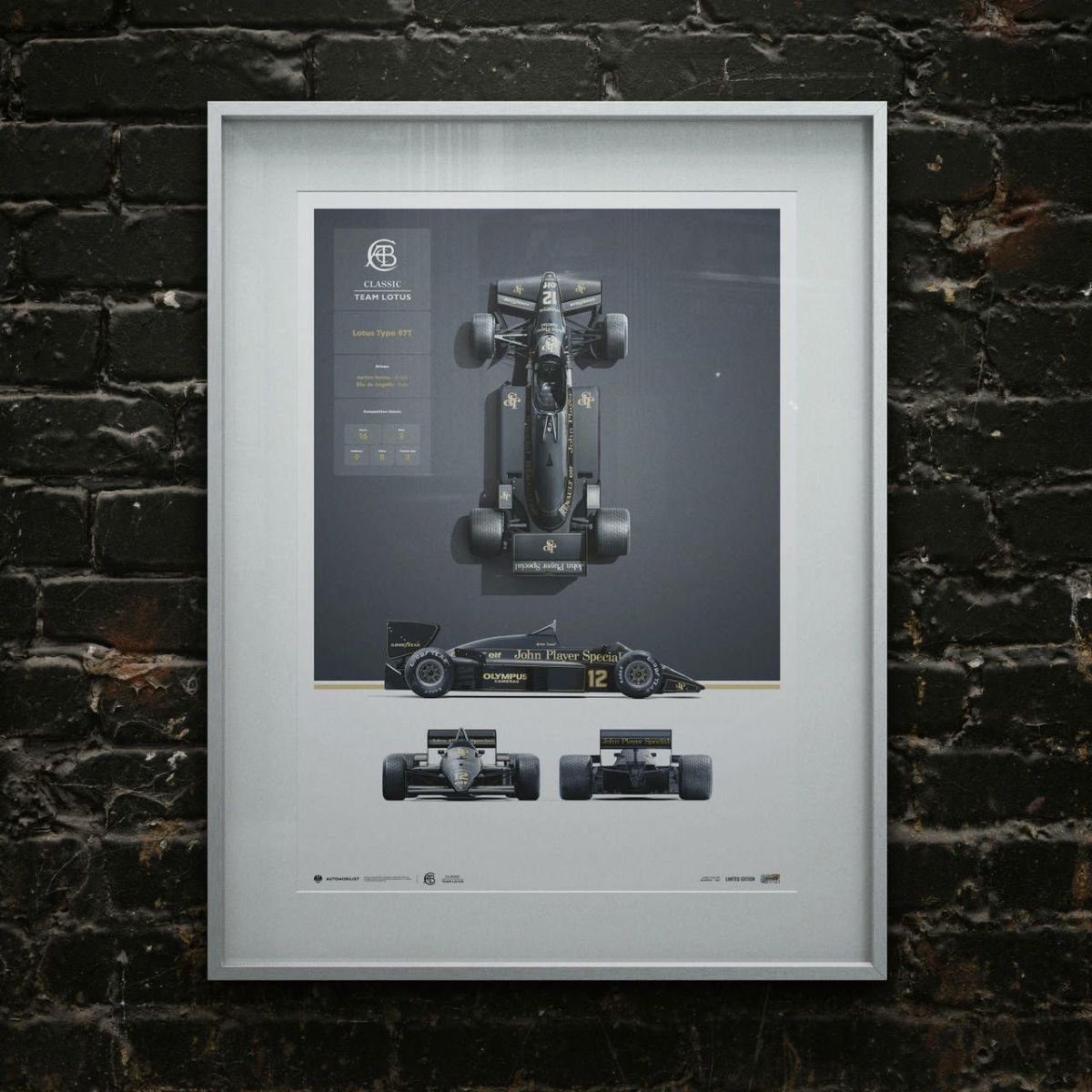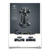 1985年のF1シーズンを戦った、ロータス 97Tのブループリント(製図)が描かれた限定グラフィカルポスター。