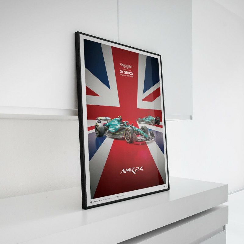 2024年シーズンをF1で戦う、アストンマーティン Aramco F1チームのAMR24のマシンを描いたグラフィカルポスター。