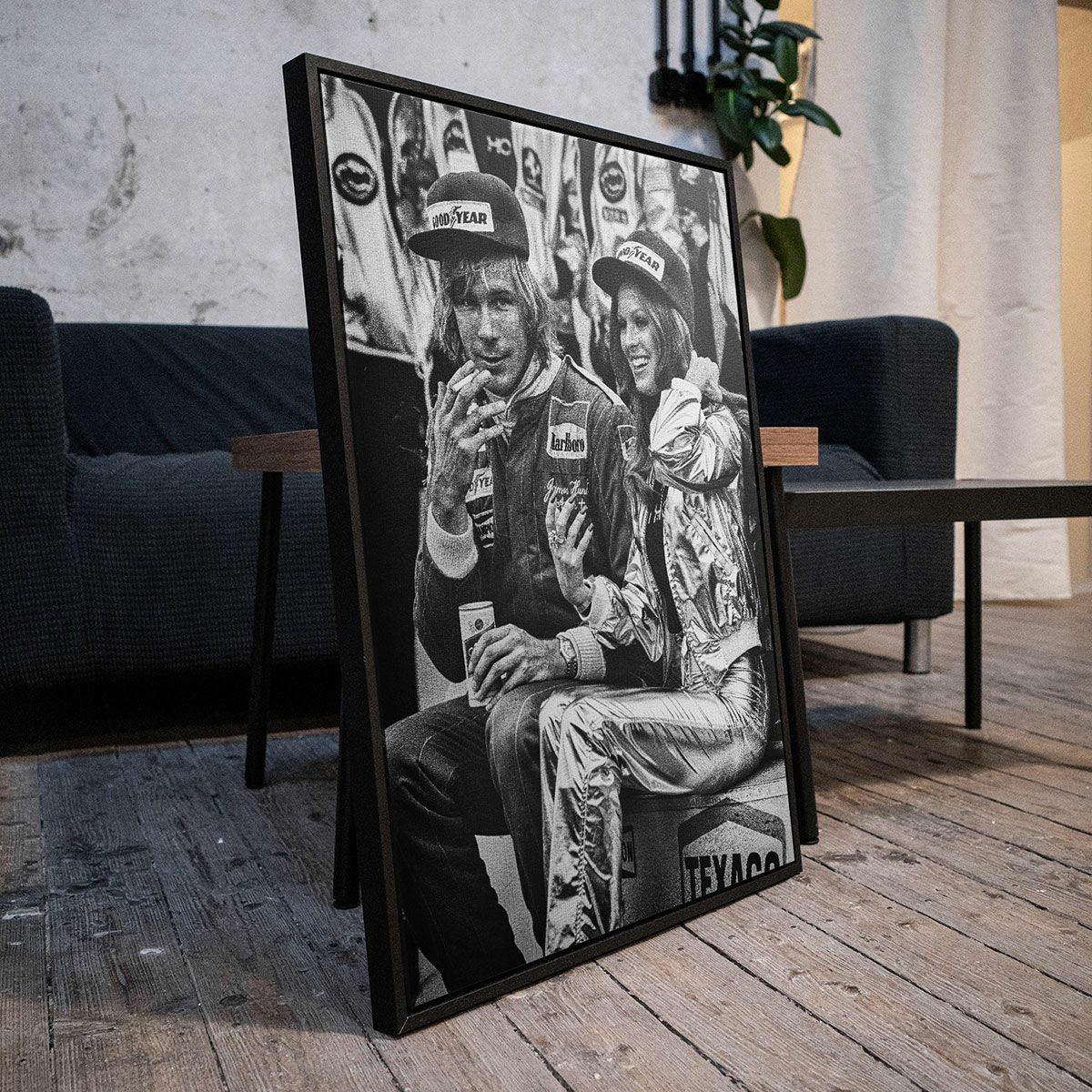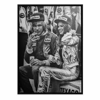 1972年から1984年にかけて、F1のドキュメンタリーをカメラに収め続けてきたリチャード・ケリー氏が、 1977年のワトキンスグレンで開催されたアメリカGPで勝利を収めたジェームス・ハントと、ペントハウス・ペットのヴィクトリア・リン・ジョンソンの2人がマクラーレン M23へ腰掛けている姿を捕らえたツーショット。表彰式を終え、シュリッツビールを片手にタバコを吸っている、まさにハントらしい一面を捕らえた瞬間をキャンバスプリントへ落とし込みました。キャンバスの外枠はウッドフレームで囲っている為、そのまま壁にかけて飾ることが可能です。
