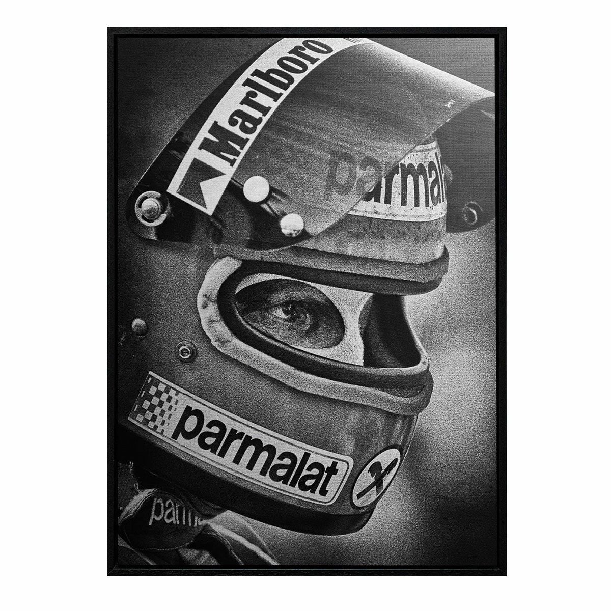 父親からの反対を押しのけ、自らスポンサー活動を行いながらモータースポーツへの世界へ飛び込んだ若かりし日々。次第にレースで成績が残し始め、着実にステップアップを果たすようになると、やがてエンツォにその才能を見出され、1975年に1度目のF1ワールドチャンピオンを獲得。1976年ドイツGPで生死を彷徨うクラッシュを起こすも、その約1か月後となるイタリアGPでレース復帰。1977年にフェラーリ 312 T2で2度目の王座獲得と共にチームと決別。そんな紆余曲折な出来事が幾度となく繰り返されても、常に這い上がり続けてきたラウダの闘争心がひしひしと伝わってくる姿をキャンバスプリントへ落とし込みました。キャンバスの外枠はウッドフレームで囲っている為、そのまま壁にかけて飾ることが可能です。