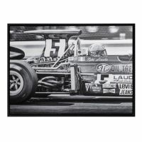 1972年から1984年にかけて、F1のドキュメンタリーをカメラに収め続けてきたリチャード・ケリー氏が、 1972年にワトキンス・グレンにて開催されたF1アメリカGPに出走したニキ・ラウダを収めたフォトショット。STP・マーチ・レーシングチームに所属していたラウダは、このレースでマーチ721Xをドライブ。予選26位からスタートし、決勝ではチェッカーを受けたものの、規定周回数に及ばなかったため、完走扱いとはなりませんでした。この3年後に彼がフェラーリで王座を獲得するドライバーになると誰が予想できたのでしょうか。そんなラウダが弱小チームで孤軍奮闘していた頃の姿をキャンバスプリントへ落とし込みました。キャンバスの外枠はウッドフレームで囲っている為、そのまま壁にかけて飾ることが可能です。