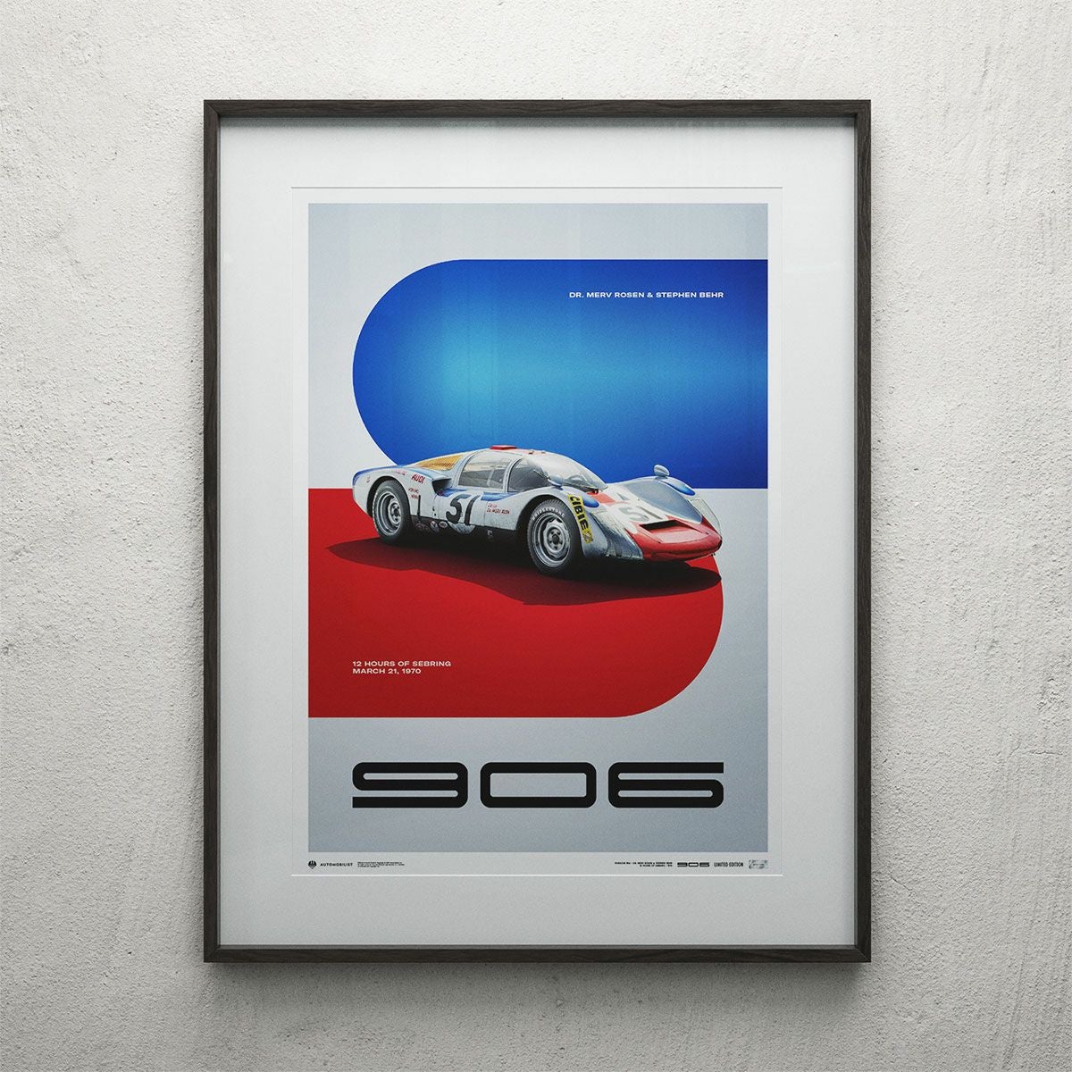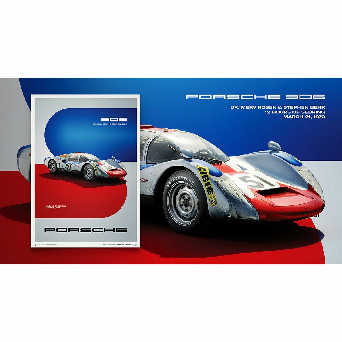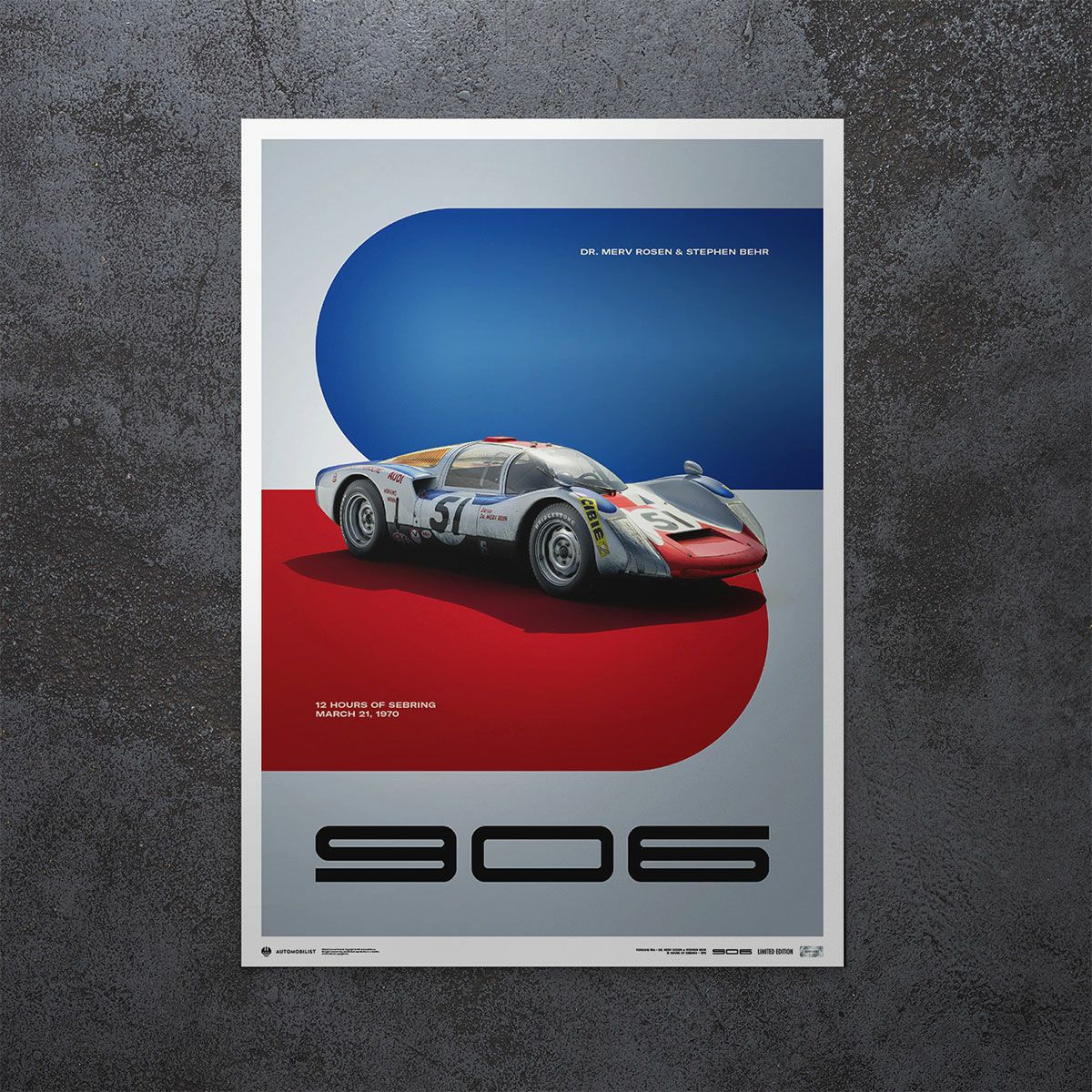 1970年セブリング12時間レースの3リッタースポーツクラスに出場した、ローゼン / ベーア組のポルシェ906-148の限定ポスター。