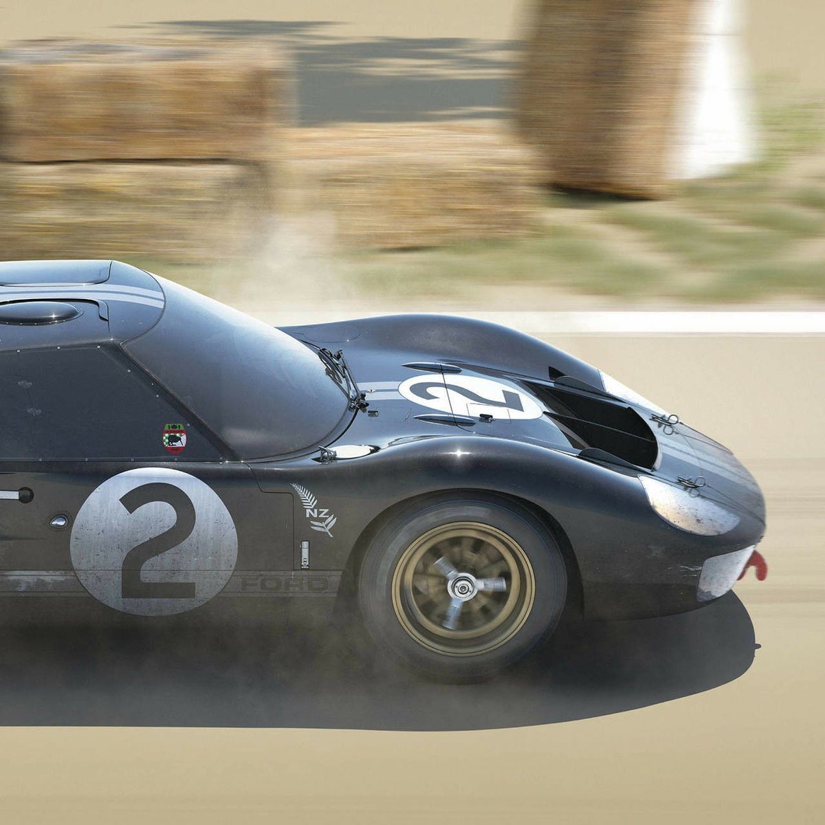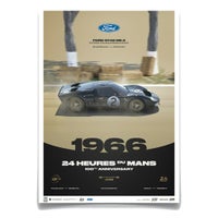 前年の雪辱を晴らすべく、8台のGT40を投入したフォード勢。レースではフォードが先行し、フェラーリ勢が追いかける展開になりましたが、フェラーリ勢はトラブルに巻き込まれ、フォードが1位~3位の表彰台を独占する活躍を見せました。ポスターには、総合優勝を果たした、クリス・エイモン/ブルース・マクラーレン組のフォード・GT40 Mk.2が描かれています。