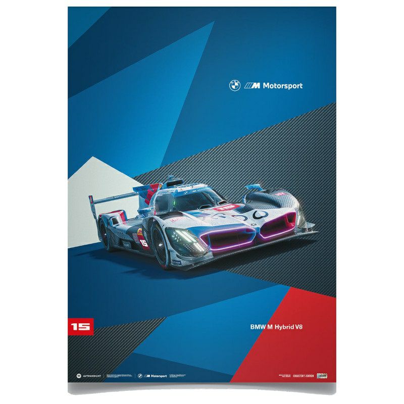 BMW M モータースポーツがル・マン・ハイパーカー(LMH)とIMSA スポーツカー選手権の参戦に向けて開発した、BMW M Hybrid V8が描かれたグラフィカルポスター。