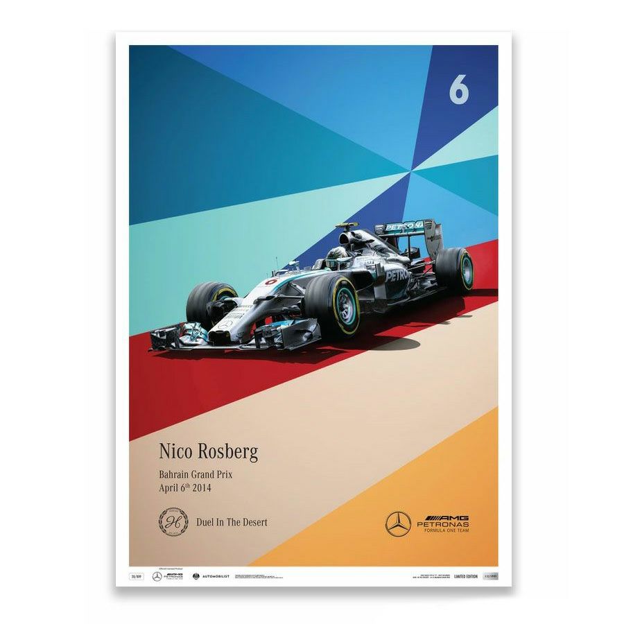 ニコ・ロズベルグがドライブする、メルセデスAMG F1 W05が描かれた2014年バーレーンGP仕様のポスター。