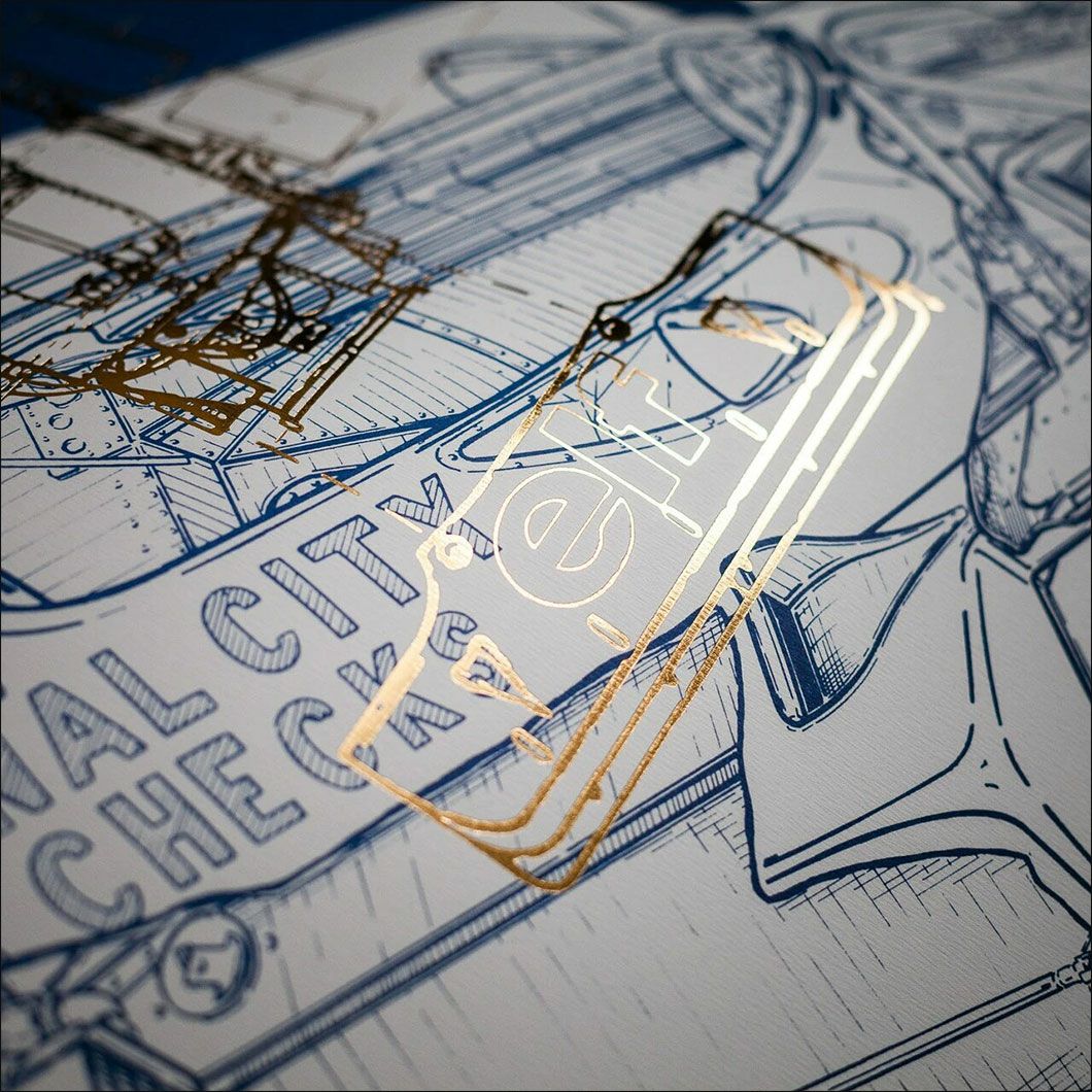 ゴールドでエンボス加工が施された透視図が描かれ、立体的に見える演出が施されています。