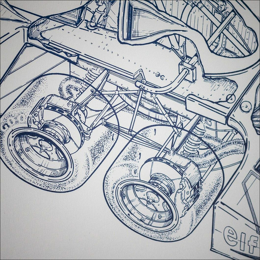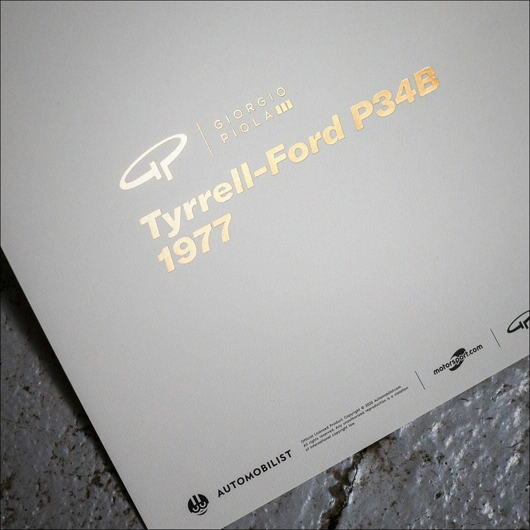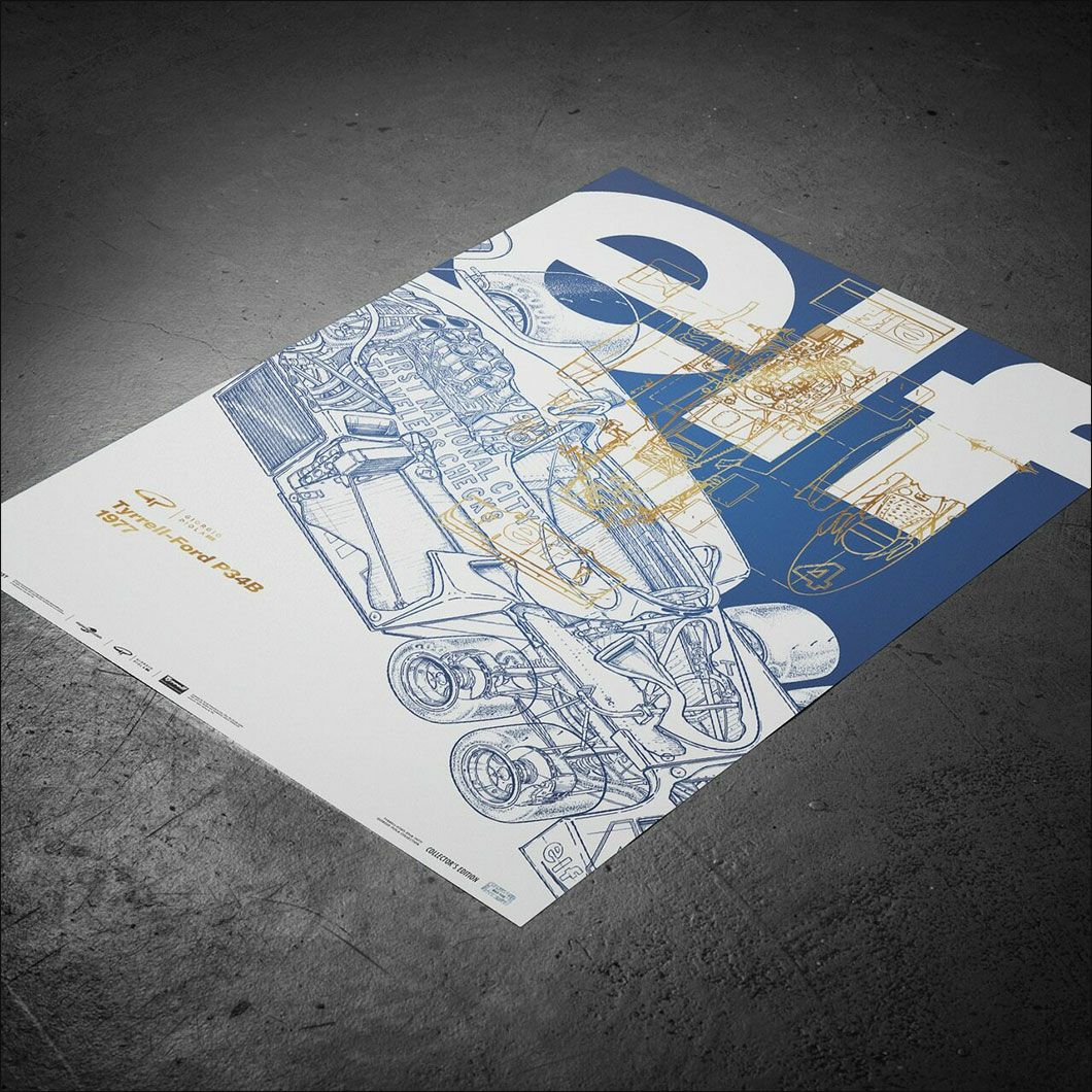 elfの大きなブランドロゴと共に、1977年仕様のタイレル(ティレル)P34の透視図がプリントされたポスター。