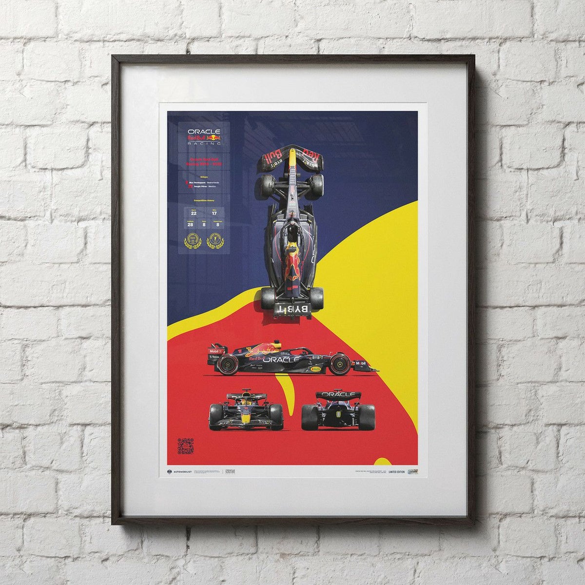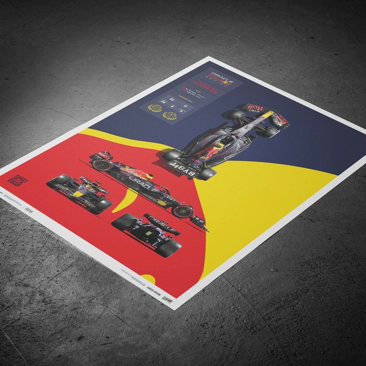 2022年シーズンのドライバーズとコンストラクターズのダブルタイトル獲得を決めた、オラクル・レッドブル・レーシングチームのチャンピオンマシン、RB18のブループリント(製図)が描かれた限定グラフィカルポスター。