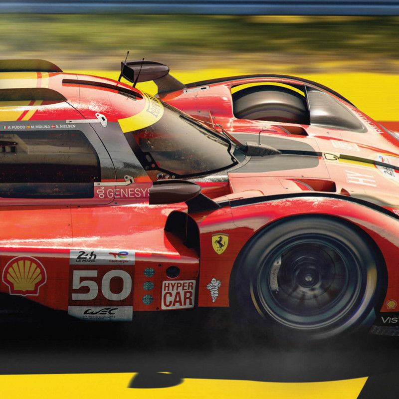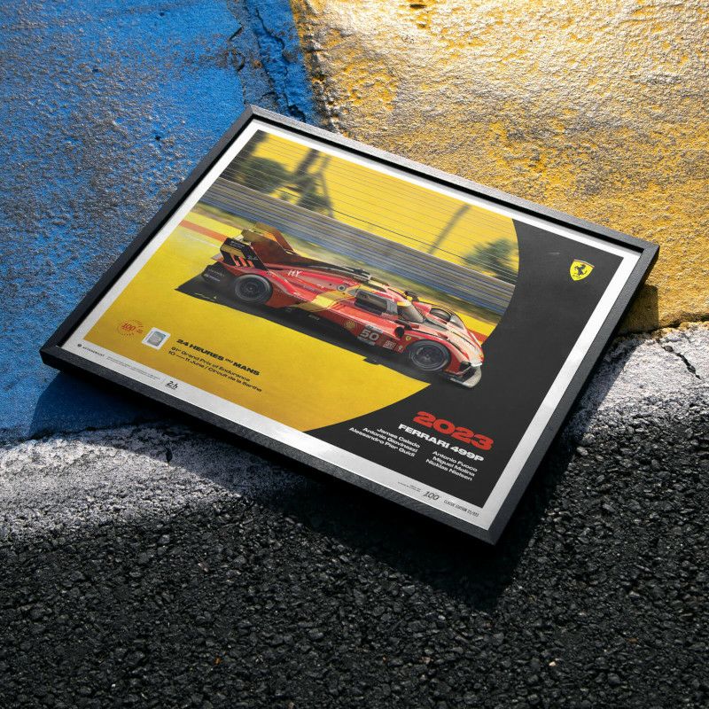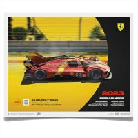 記念すべき2023年のハイパーカークラスにエントリーした、フェラーリAFコルセチームのフェラーリ 499S(50号車)を描いたグラフィカルポスター。予選でアタッカーを務めたアントニオ・フォコが3分22秒982の驚速タイムを記録し、ポールポジションを獲得。レースでも接近戦バトルを繰り広げ、途中ピットで修復作業を受けるも、7位でチェッカーを受けました。