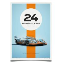 1971年のル・マン24時間レースで総合2位に入賞したガルフカラーのポルシェ917が描かれたグラフィカルポスター。