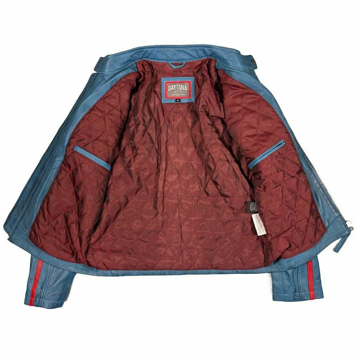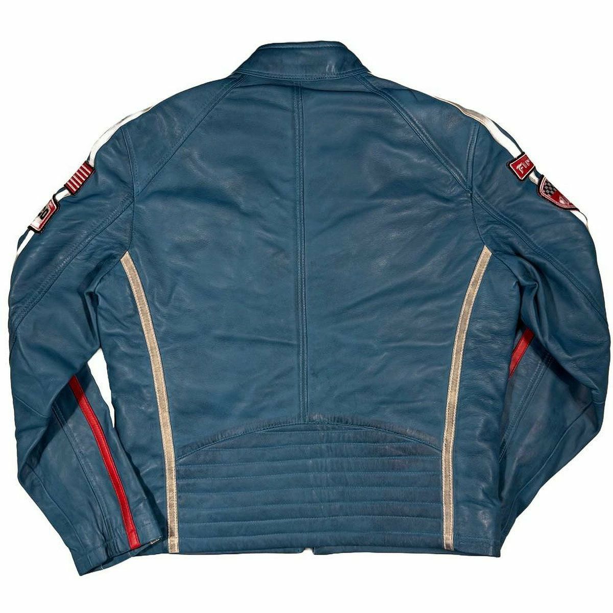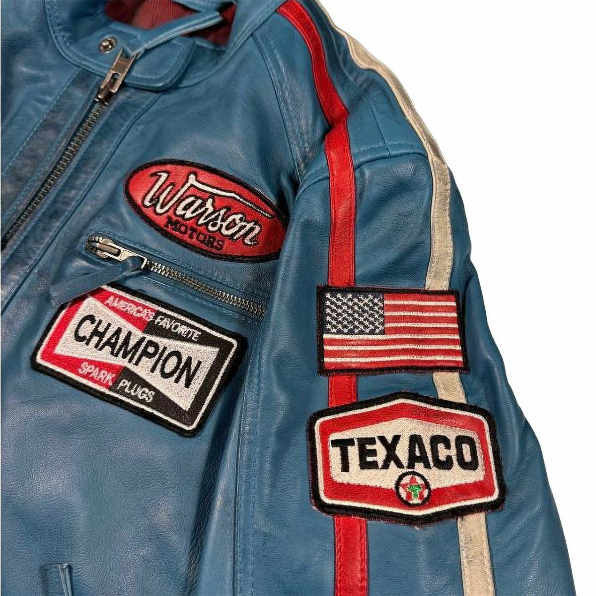 STP、EDELBROCK、CHAMPION、TEXACO、、、往年のモータースポーツファンには馴染み深いスポンサーワッペンが随所にちりばめられた一着。柔らかく着心地の良い山羊革を使用しています。両サイドに配されたストライプがスポーティ&レーシーな雰囲気を醸し出しています。サイズ感について