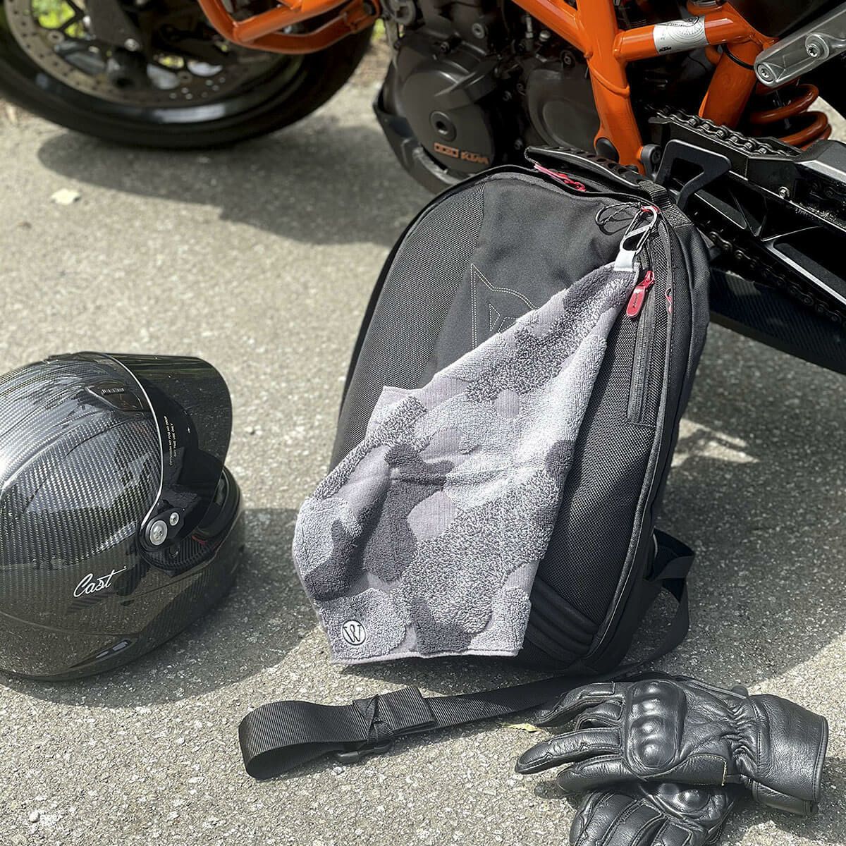 ふんわりやわらかなパイルを使用し汗をしっかり吸収。ループにカラビナを取り付けてアウトドアや登山、スポーツにも◎。