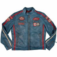 STP、EDELBROCK、CHAMPION、TEXACO、、、往年のモータースポーツファンには馴染み深いスポンサーワッペンが随所にちりばめられた一着。柔らかく着心地の良い山羊革を使用しています。両サイドに配されたストライプがスポーティ&レーシーな雰囲気を醸し出しています。サイズ感について