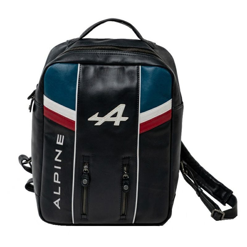 ポール・ループ・シャタン コレクションとしてリリースされた、アルピーヌ A424 レザー バックパックは、A424のマシンカラーである濃いブルー基調に、アルピーヌのオフィシャルロゴやパッチがあしらわれており、フランス国旗のトリコロールカラーや、ホワイトのパイピングがレザーの切り替えし部分に施されています。また、チェッカー柄のナイロン生地がインナーにプリントされるなど、アルピーヌのイメージとディテールに拘ったデザインが特徴的なレザーバックパックです。