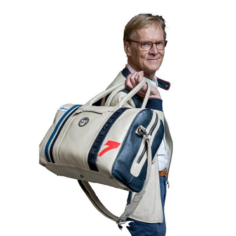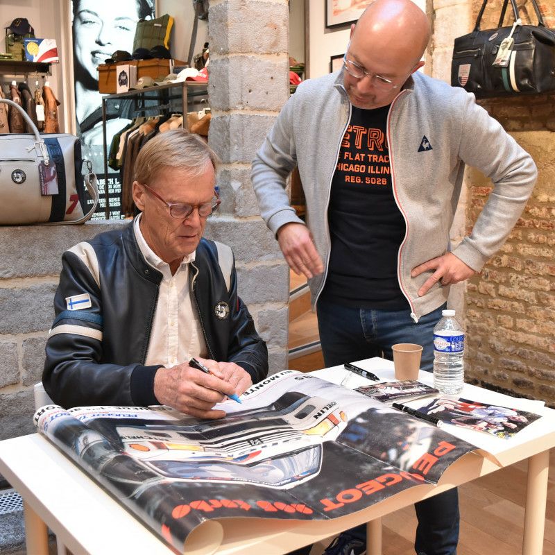1981年に事実上プライベーターチームだったフォードでWRCのチャンピオンを獲得後、WRC撤退を表明したプジョーと共に、パリ・ダカール・ラリーに参戦し、3度の優勝を飾ったことで、砂漠のライオンという異名を持ちました。そんな活躍を見せていたバタネンのレース戦歴に欠かせないレースのひとつとして挙げられるベストレースが、1988年のパイクスピーク・インターナショナル・ヒルクライムでした。このレースでプジョー 405 T16のステアリングを握ったバタネンは、10分47秒22というタイムでコースレコードを樹立し優勝。バタネンが得意とする大胆かつアグレッシブなドライビングにより、当時最強のライバルだったアウディの牙城を崩した瞬間でもありました。レザージャケットのインナーには、眩しく照りつける西日を右手で覆いながら、アクセル全開でタイムアタックに挑むバタネン渾身のワンシーンがプリントされており、このタイムアタックは"Climb Dance"とも呼ばれました。