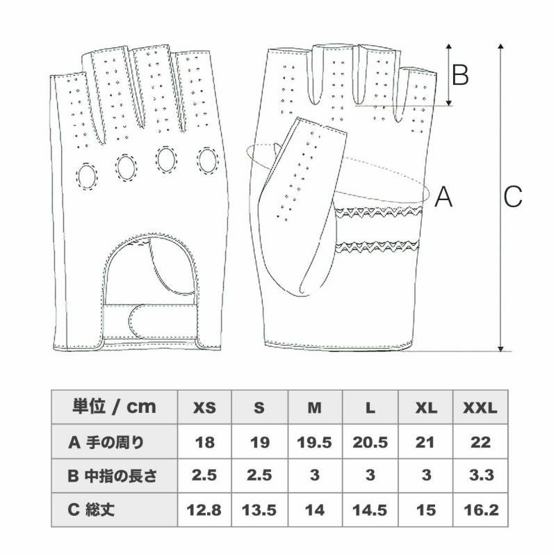 ※A:手の周り、B:中指の長さ、C:グローブ総丈