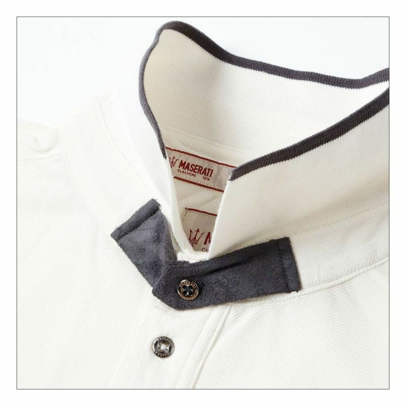 MASERATI CLASSICHE 1914 純正のポロシャツ。襟、袖口、ポケットの縁がシャツ本体のカラ‐とは別カラーにあしらわれており、後身頃のテールが前身頃よりも少し長めになっています。