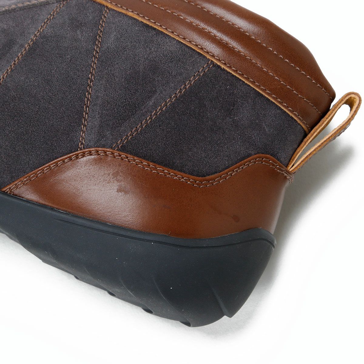 G.P.Hiのラストデザインは細身でメリハリの効いたシルエットとは対象的に、爪先にしっかりと厚みがある履き心地が特徴の新木型GRSを採用。アッパーに使用したバーニッシュスエードは、オイルが含有する性質によって柔軟でしなやかな足あたりです。G.P.Hiに使用しているレザーインソールには立体的なアーチサポートにデザインした厚めのクッション素材を搭載。足全体をストレス無く持ち上げる構造によって独特なフットフィールを感じることが出来ます。そして、靴紐を外すことなく着脱できるラバーシューレースは、ハイトップスニーカー特有の着脱時の煩わしさを軽減し、アクセスしやすいデザインになっています。