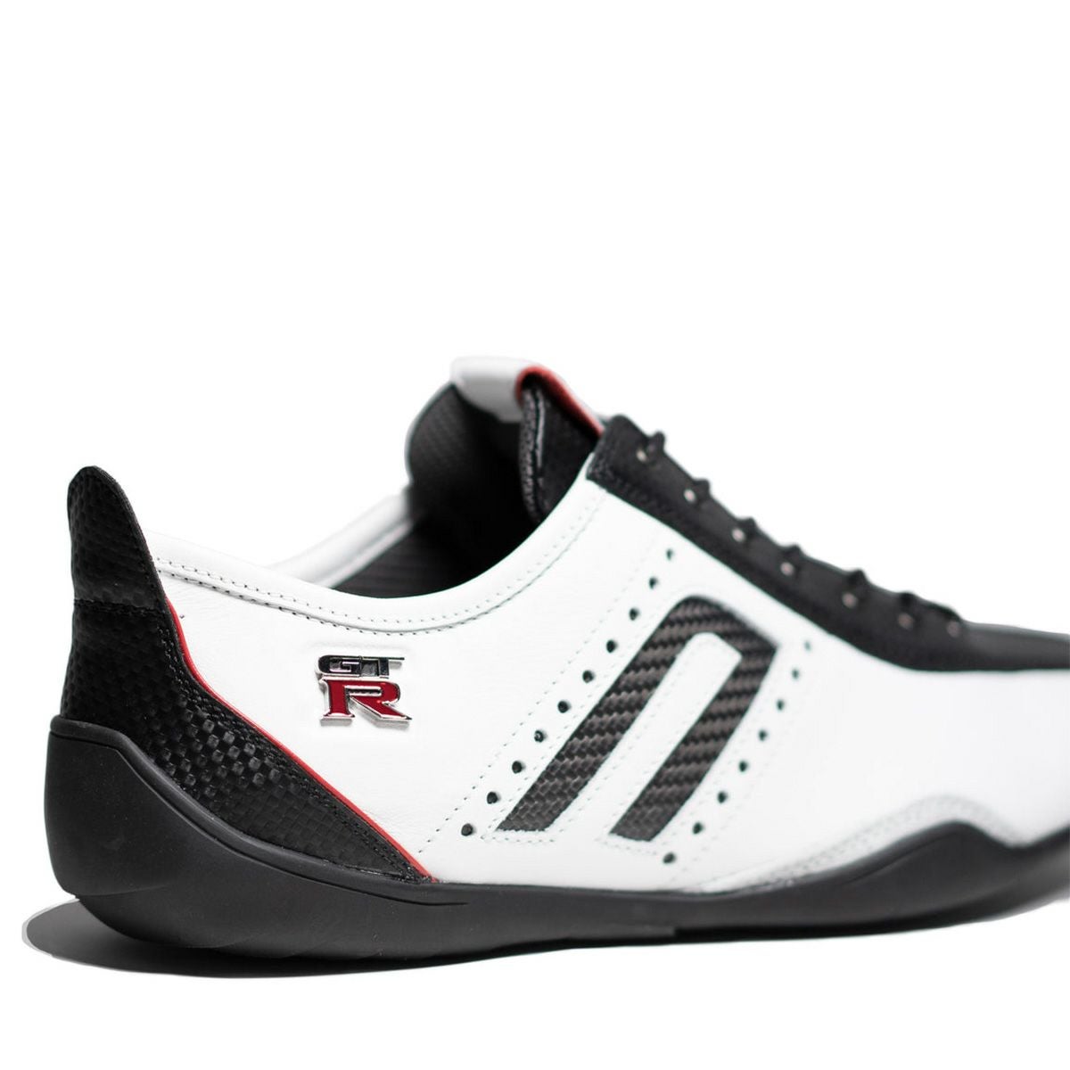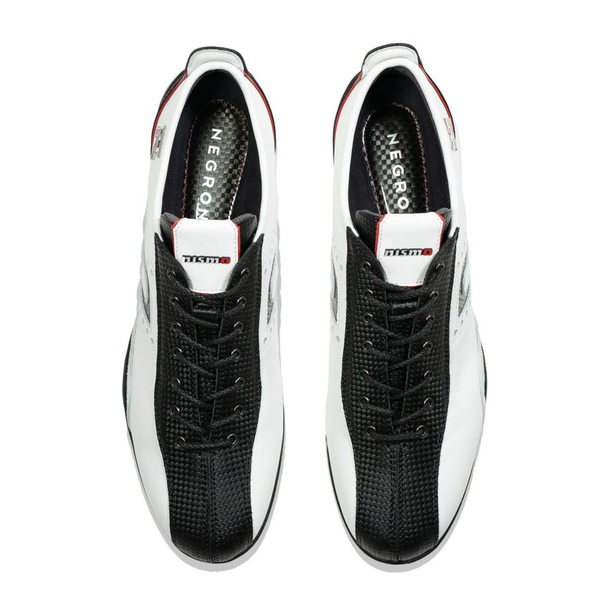 イデアコルサはドライビングシューズの理想系を目指してデザインされたネグローニのフラグシップモデルです。 足全体をホールドする力強いフィット感によって、スポーツドライビングにおける抜群の操作性と快適性を誇ります。その類まれなフットフィールが長年に渡りGT-RとフェアレディZの開発を手がけた田村氏によって見出され、今回のコラボレーションが実現しました。本作では、ヒールガードをNISSAN GT-Rのテールデザインからインスパイアされた力強いデザインにアップデート。アクセントとなるパイピングラインにはNISMOのエクステリアをイメージしたレッドカラーを採用しています。ベロ部分は立体形状に変更し、イデアコルサのベースグレードよりもより高いフィット性を実現しました。