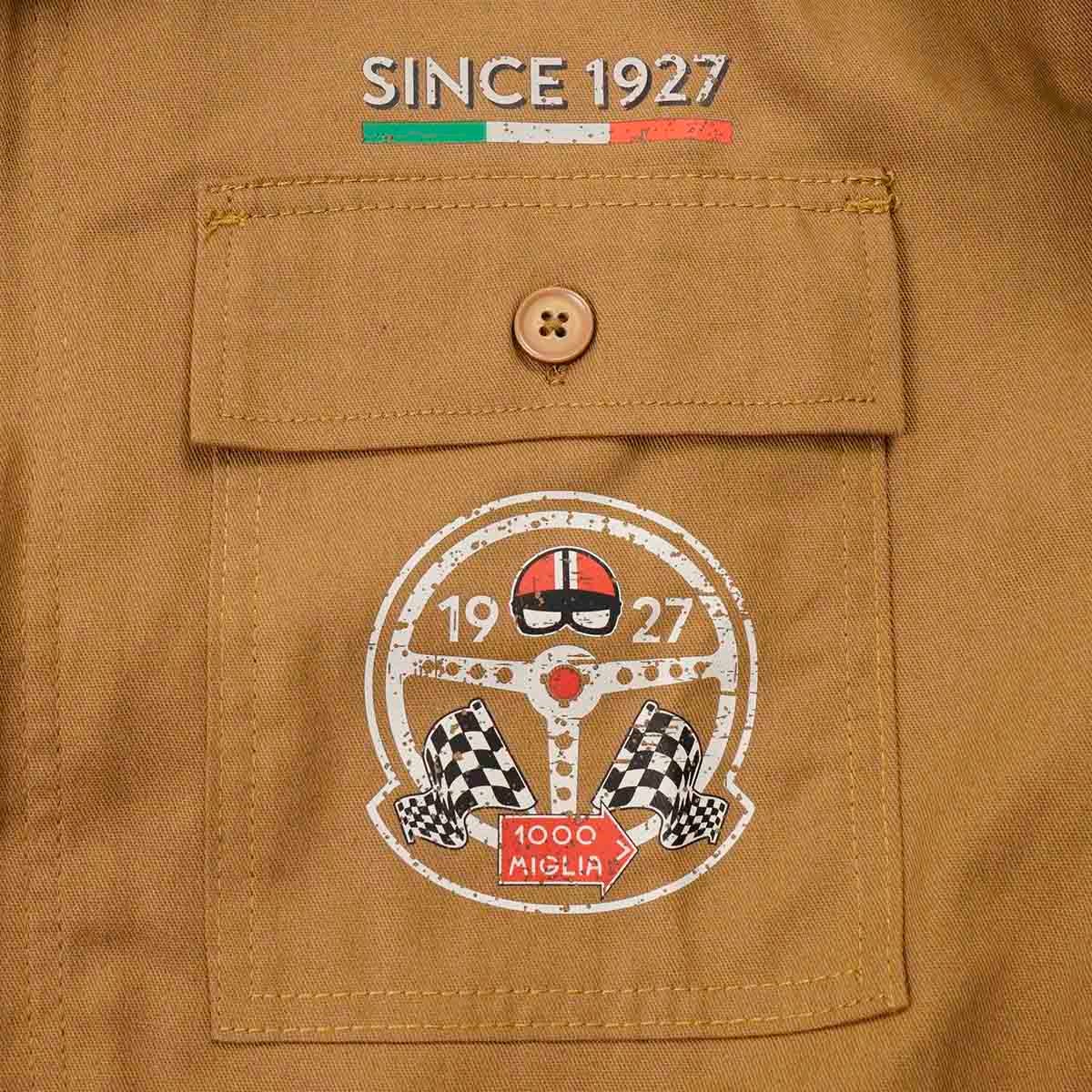 落ち着いた風合いのカーキカラーをベースに、胸元や袖、背中など随所に「1000 Miglia」のアローロゴを配置。ヴィンテージ感漂うデザインは、愛車のメンテナンス時はもちろん、ガレージライフやカジュアルなタウンユース、クラシックカーイベントでの着用にも最適です。