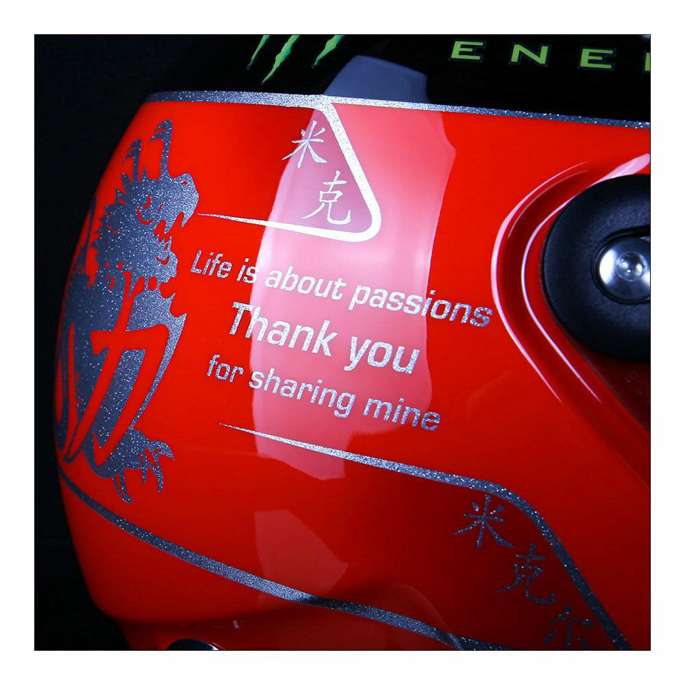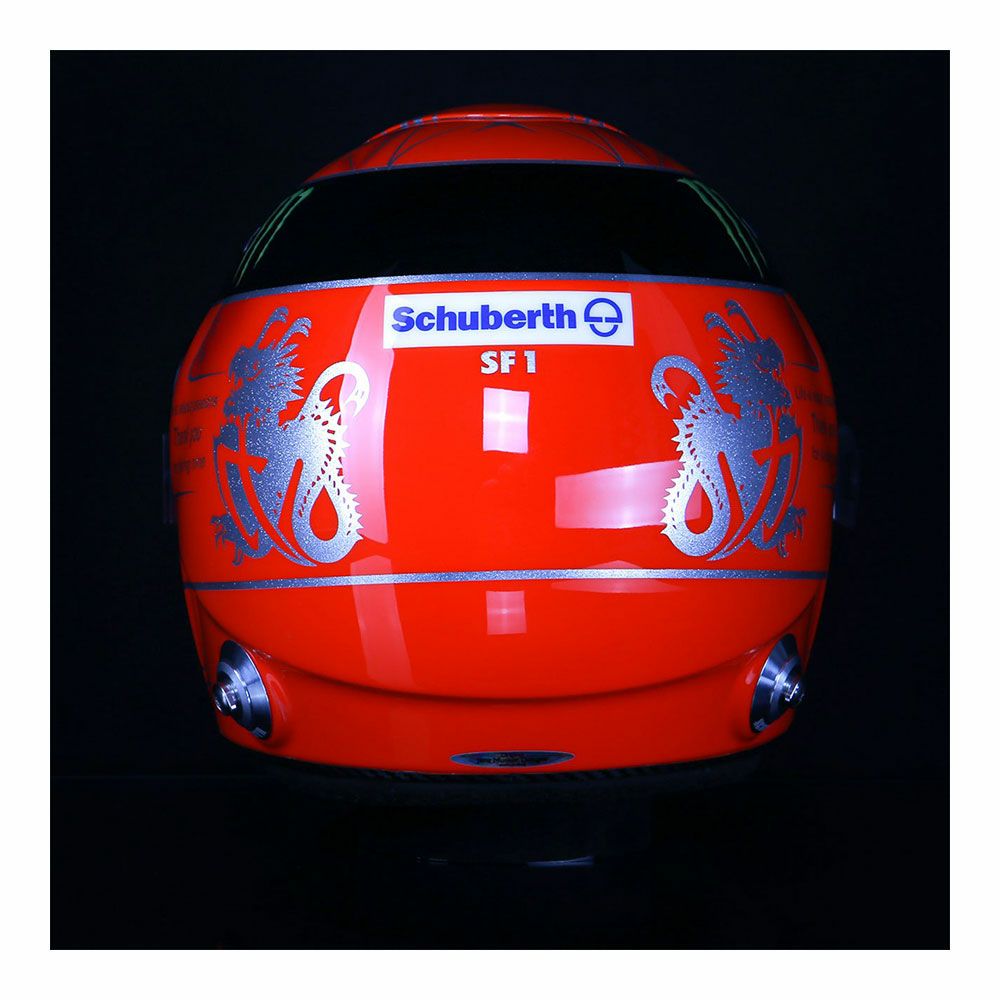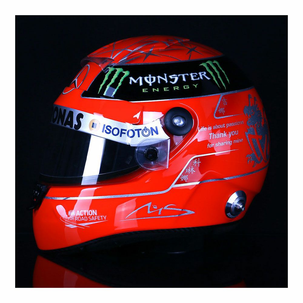 実際に供給されていたシューベルト製のカーボンヘルメットをベースに使用しており、ミハエル"最後"のF1レースとなった2012年ブラジルGP仕様のスペシャルデザインのヘルメットは、最終戦のヘルメットのみに刻まれたメッセージなども忠実に再現。