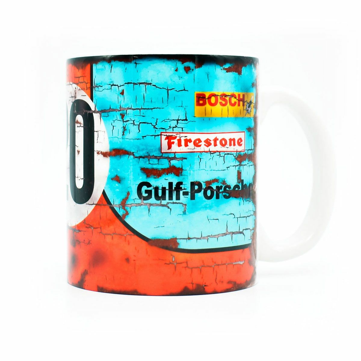 映画「栄光のル・マン」に登場するガルフカラーのポルシェ917をモチーフにしたマグカップ。