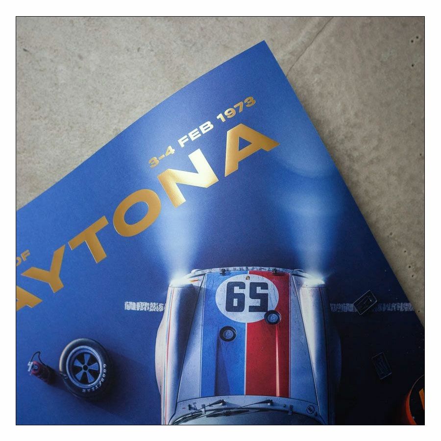 1973年のデイトナ24時間レースにて総合優勝を飾った、ブルモス・ポルシェの911 カレラ RSR 2.8を描いたポスター。