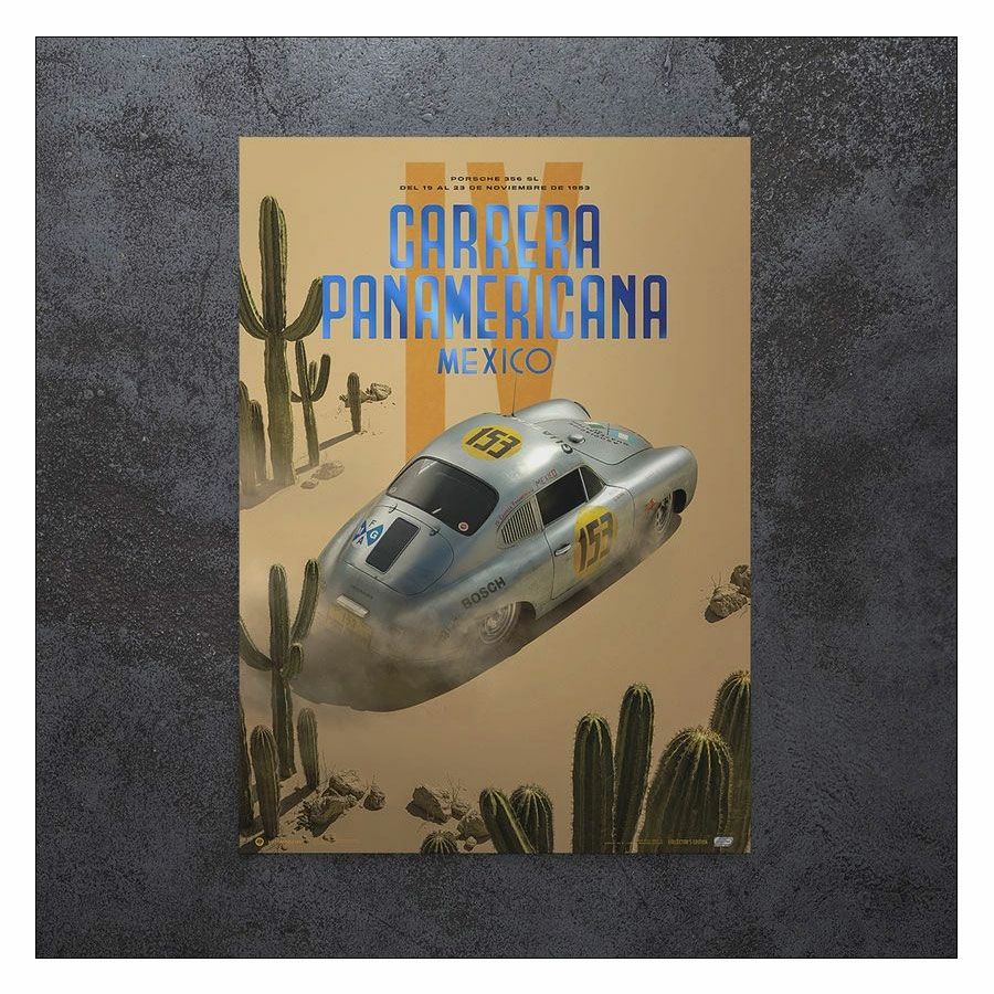 1953年のカレラ・パナメリカーナに参戦したポルシェ356SLを描いたポスター。