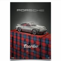今回のグラフィカルポスターは、ポルシェ・ヒストリー・シリーズとして登場した、ポルシェのオフィシャルライセンスプロダクト。初代911ターボのアイコンとなった、レッドとネイビーのタータンチェック柄を用いたクッションには「TURBO」の文字が見え隠れしており、その上に、独ポルシェミュージアムに展示されている911ターボが鎮座する様子が描かれています。