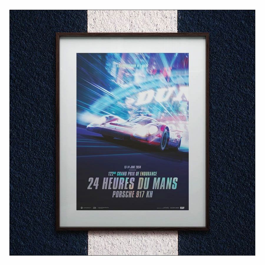 2054年のル・マン24時間レースに、1970年のル・マン覇者であるザルツブルグカラーのポルシェ917が走行している未来予想図を描いたポスター。