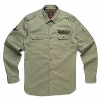 使い勝手良さからお勧めのアーミーシャツ。左胸ポケット直上に配されたブランドネームのワッペンがポイントです。
